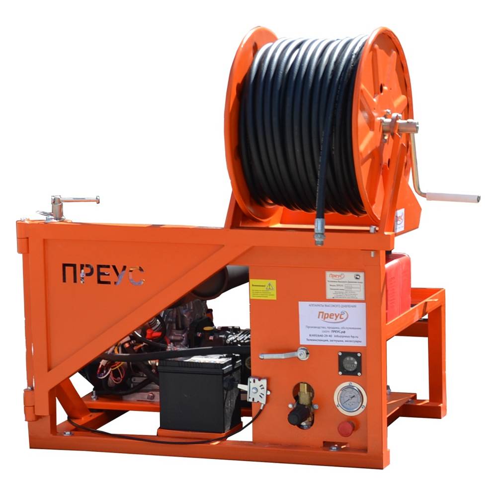 Каналопромывочная установка ПРЕУС Б2050КРэ L (Б1565КР) с электроприводом барабана — это профессиональное оборудование для гидродинамической очистки канализационных труб и поверхностей. Она оснащена бензиновым двигателем, насосом высокого давления и стальным барабаном с электроприводом для удобства подачи шланга.