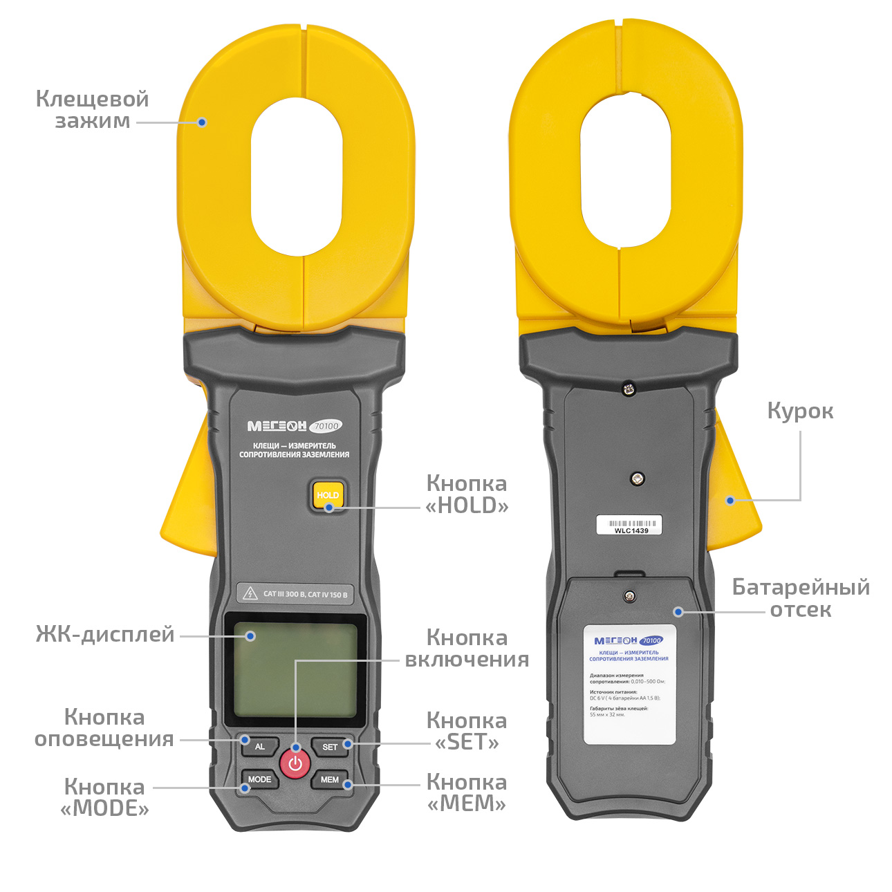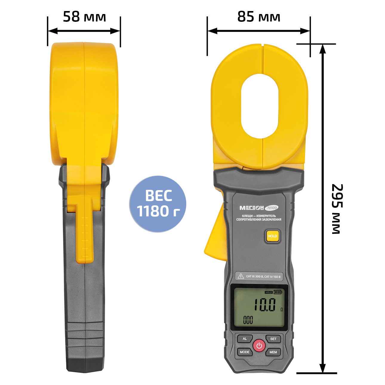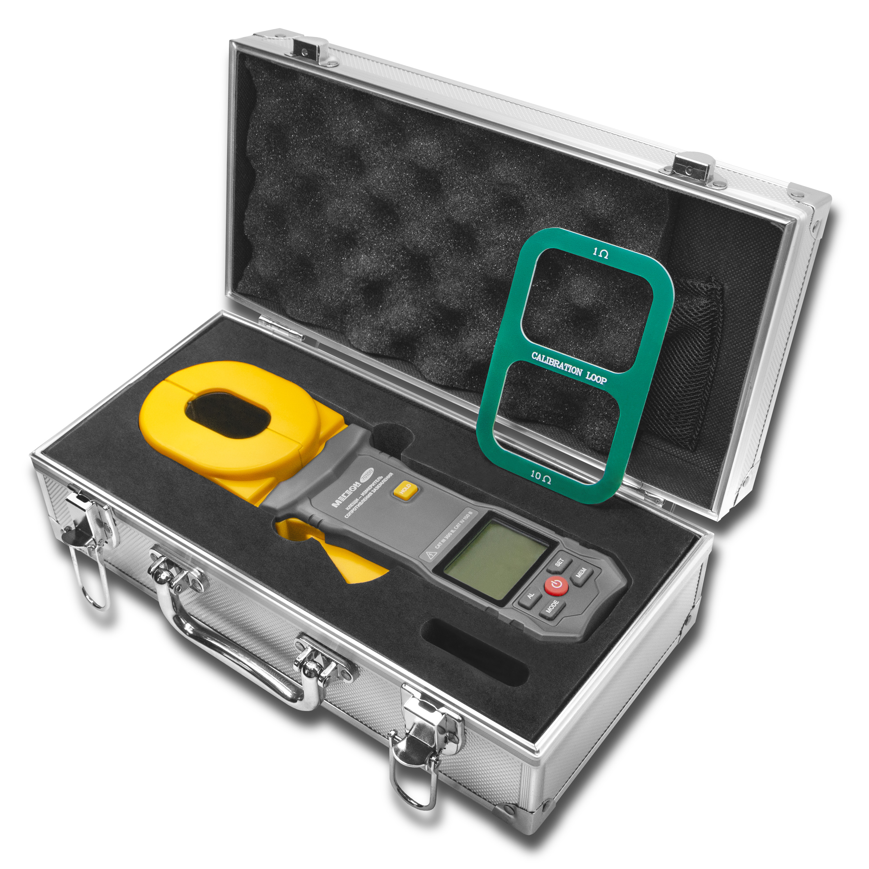 Клещевой измеритель заземления МЕГЕОН 70100 предназначен для измерения сопротивления заземляющих устройств бесконтактным неразрушающим способом и может быть полезен в случаях, когда тестирование обычными методами выполнить сложно или невозможно. Прибор имеет ударопрочную влагозащищённую конструкцию, контрастный жидкокристаллический дисплей с подсветкой, встроенную память для сохранения выполненных тестов, звуковое оповещение о выходе за пределы диапазона, автономное питание и функцию автоматического выключения при длительном бездействии. В основе принципа работы используется свойства взаимной индукции двух катушек, где первая индуцирует потенциал заданной величины и в контуре генерируется ток, а с помощью второй этот ток измеряется и затем, согласно закону Ома, вычисляется сопротивление.