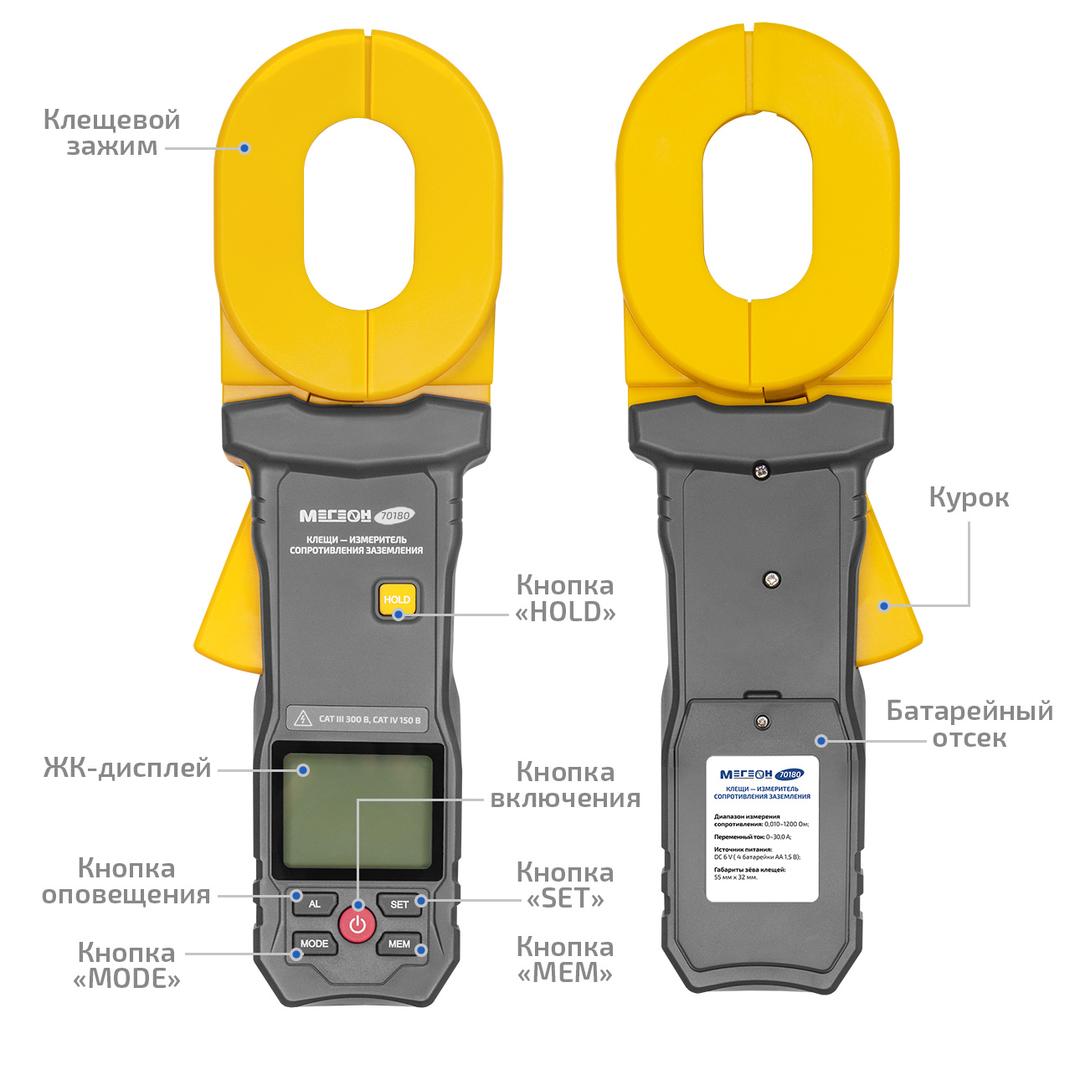 Клещевой измеритель заземления МЕГЕОН 70180 предназначен для измерения сопротивления заземляющих устройств и тока утечки бесконтактным неразрушающим способом и может быть полезен в случаях, когда тестирование обычными методами выполнить сложно или невозможно. Прибор имеет ударопрочную влагозащищённую конструкцию, контрастный жидкокристаллический дисплей с подсветкой, встроенную память для сохранения выполненных тестов, звуковое оповещение о выходе за пределы диапазона, автономное питание и функцию автоматического выключения при длительном бездействии. В основе принципа работы используется свойства взаимной индукции двух катушек, где первая индуцирует потенциал заданной величины и в контуре генерируется ток, а с помощью второй этот ток измеряется и затем, согласно закону Ома, вычисляется сопротивление.