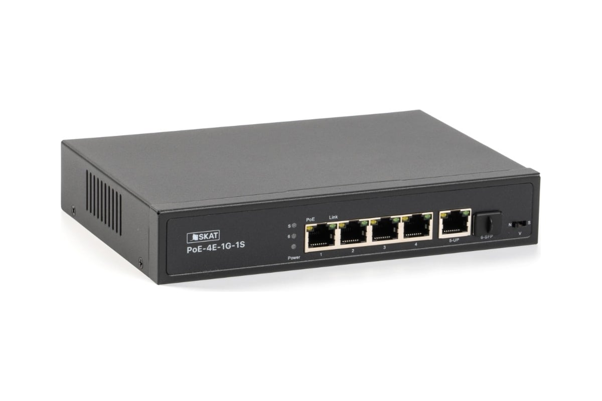 SKAT PoE-4E-1G-1S представляет собой специализированный неуправляемый PoE коммутатор для использования в системах видеонаблюдения и безопасности. Характеризуется высокой надежностью работы благодаря защите от электростатических разрядов и перепадов напряжения, позволяет организовать качественную передачу информации в сети Ethernet.