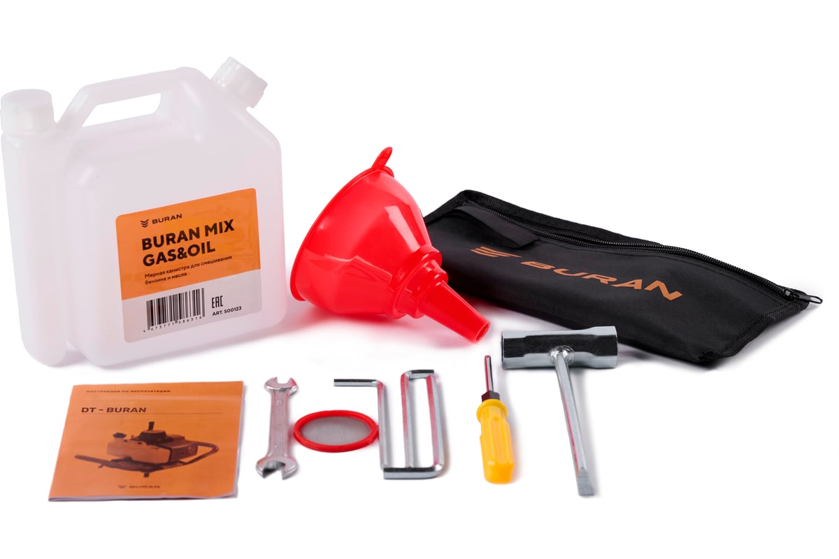 Мотобур поставляется с комплектом ключей для обслуживания, воронкой и мерной канистрой для смешивания масла с бензином. Посадочный вал имеет стандартизированный размер 20мм и может быть укомплектован соответствующими шнеками и аксессуарами, при этом производитель рекомендует обратить внимание на широкую линейку обычных и усиленных шнеков BURAN.