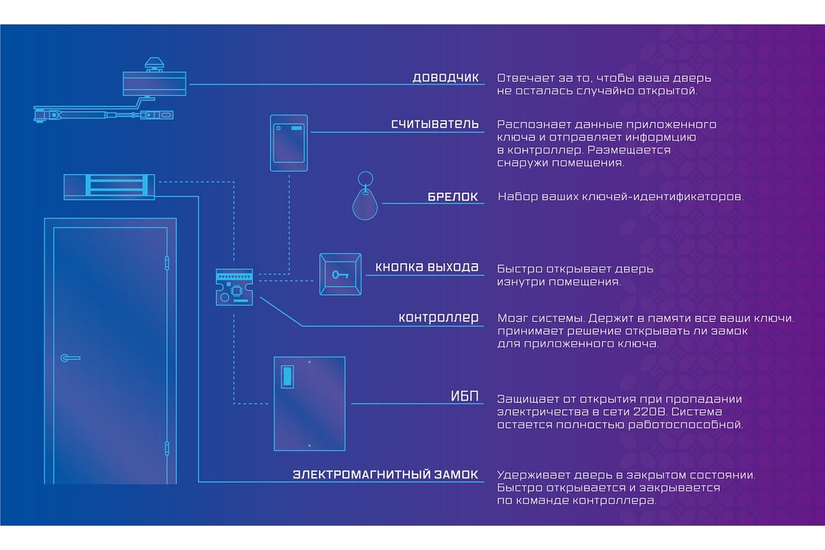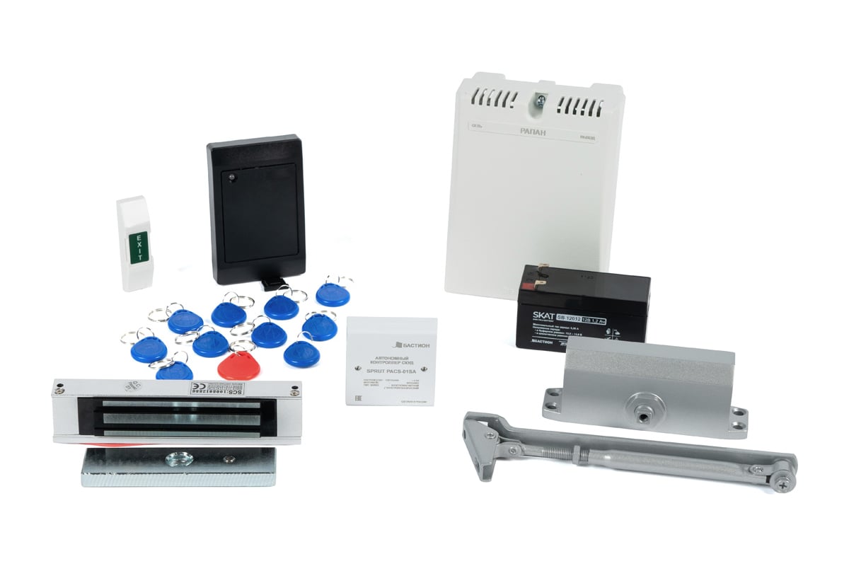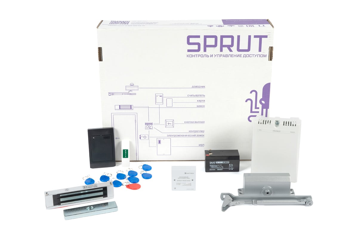 Комплект системы контроля доступа (СКУД) SPRUT – готовое решение, включающее в себя устройства, которые необходимы для организации автономной системы контроля доступа. После монтажа устройств из комплекта вы получите надежно запирающуюся дверь с доводчиком, быстро открывающуюся при помощи электронных ключей, отсекающую нежелательных посетителей. Комплект рассчитан на установку человеком, не имеющим специальных знаний по монтажу и настройке СКУД, поэтому для облегчения задачи по установке есть подробные инструкции в бумажном формате и на видео.