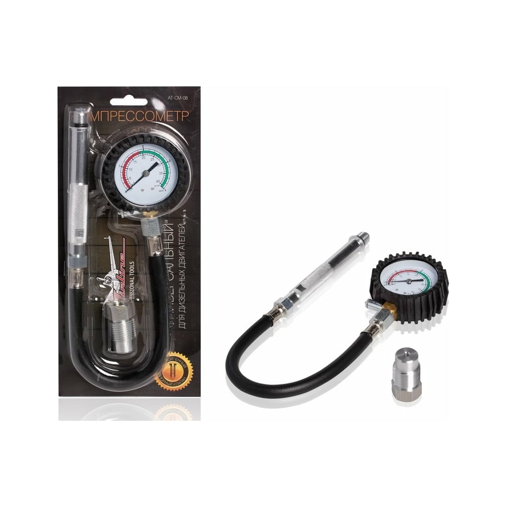 Универсальный дизельный компрессометр Airline, манометр в резиновом чехле, блистер AT-CM-08 защищен резиновым чехлом, благодаря чему имеет долгий срок службы. Запорный клапан новой усиленной конструкции. Компрессометр состоит из манометра, присоединительного шланга с резьбовым наконечником, запорного клапана.