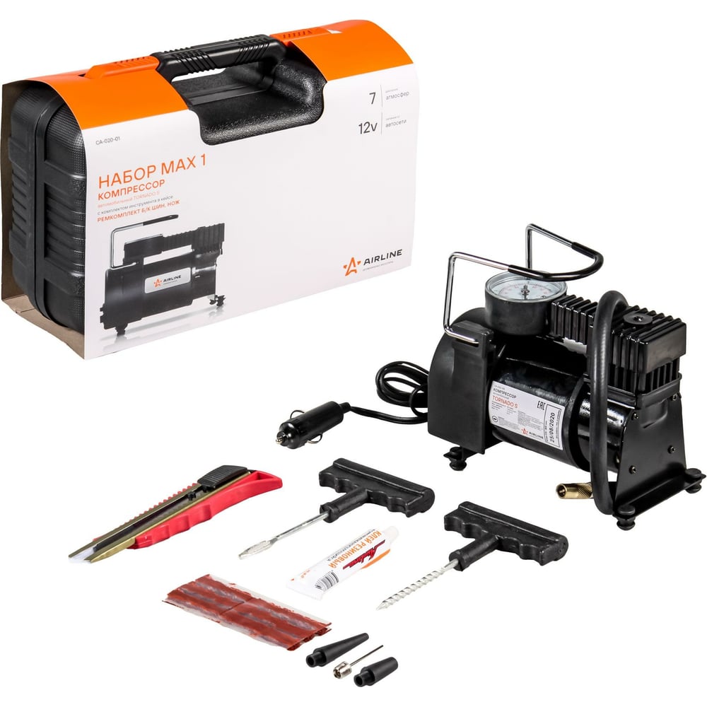 Компрессор AIRLINE TORNADO S с комплектом инструмента, в кейсе, ремкомплект для бескамерных шин, нож CA-020-01 предназначен для получения сжатого воздуха в дорожных условиях. Мы положили компрессор в надежный пластиковый кейс и добавили в набор ремкомплект для б/к шин с клеем. Компрессор модели TORNADO S имеет производительность до 30 л/мин с максимальным давлением 7 Атм (кг/см2). В данном компрессоре используется конструкция с плавающим шатуном, что увеличивает ресурс работы в 2-3 раза, по сравнению с более мощными "металлическими компрессорами". Время накачивания полностью спущенного колеса R14 до 2 Атм не превысит 4 минут. В комплекте 3 дополнительные насадки. Дополнительные характеристики: Мощность, Вт: 60 Напряжение: 12 – 13.5 В Производительность: 30 л/мин (1,8 куб.м/час) Максимальное давление: 7 Атм (кг/см2) (7,1 Бар) Максимальный ток: 5,5 А Время непрерывной работы: до 15 мин Манометр: Встроенный механический Длина кабеля питания: 2,4 м Длина шланга: 0,6 м Время накачивания колеса R14 от 0 до 2 Атм: 4 мин