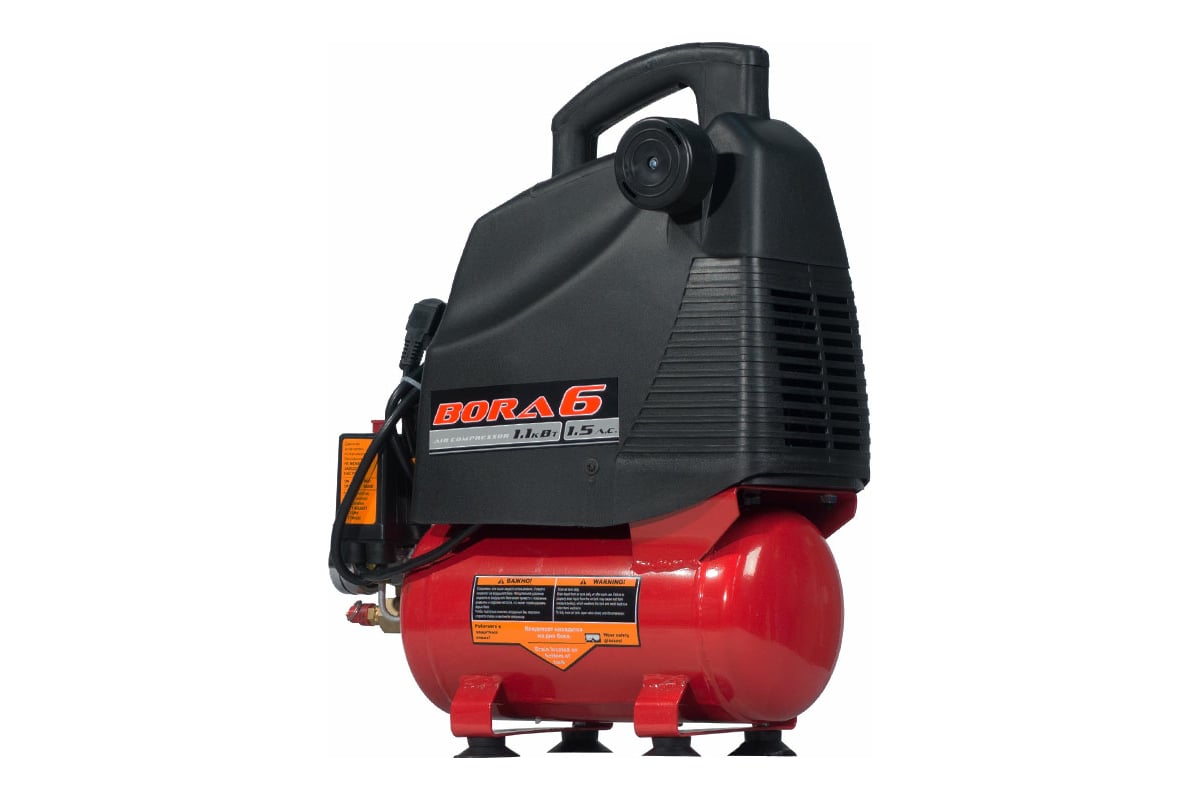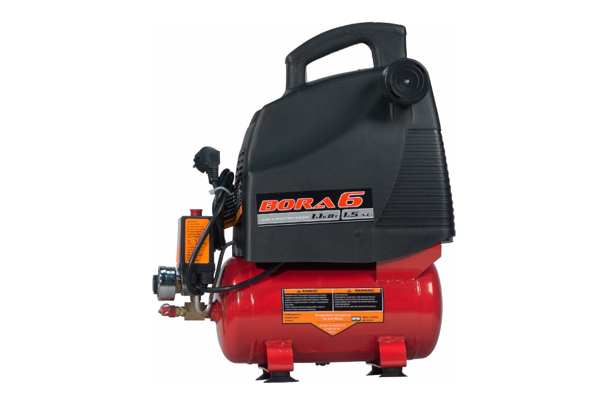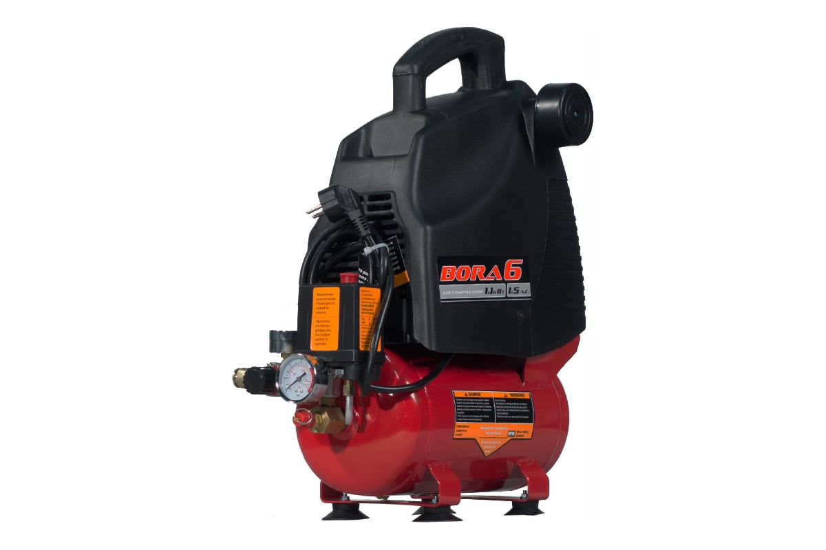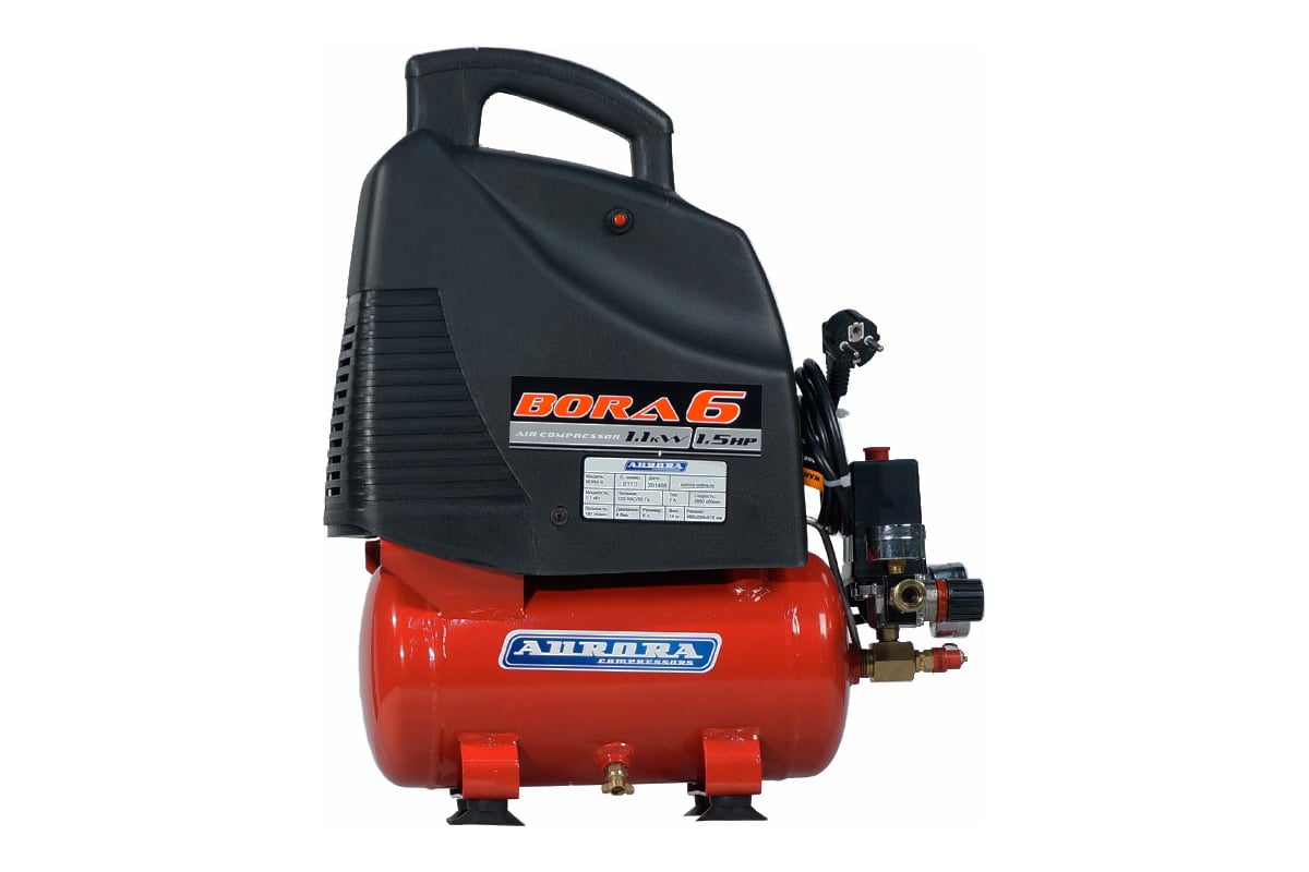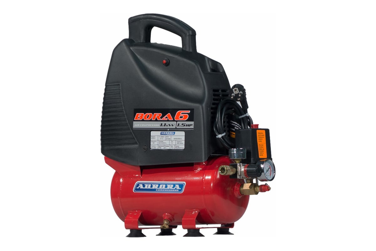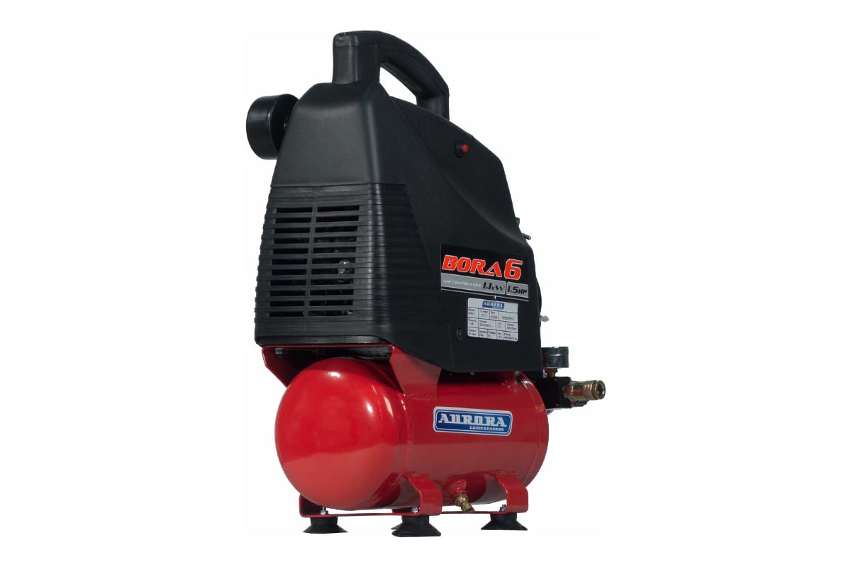 Поршневой безмасляный компрессор Aurora BORA-6 14775 - устройство для нагнетания воздуха под давлением. Модель широко применяется в частных гаражах, ремонтных мастерских, небольших автосервисах, а также на строительных площадках. Установка имеет спусковой клапан, который останавливает работу при достижении максимального давления. Конструкция агрегата предусматривает рукоятку для легкой и удобной транспортировки. Выходной воздух отличается высоким качеством и не содержит примесей масла.