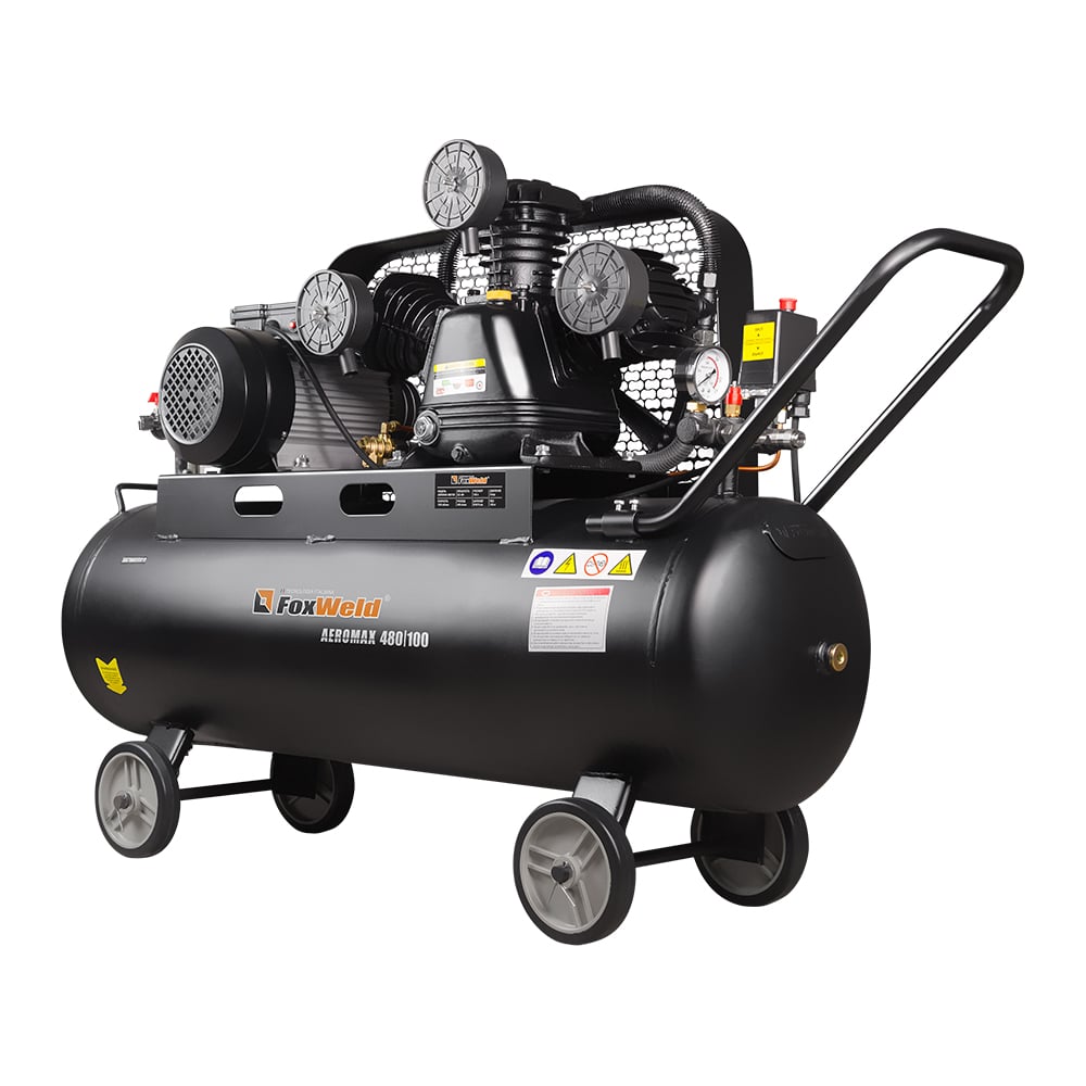 Ременной компрессор Foxweld AEROMAX 480/100 5887 - воздушный трехпоршневой масляный компрессор с ременным приводом с увеличенной производительностью в 480 литров в минуту и вместительным ресивером на 100 литров. Предназначен для всех видов профессиональных работ. Данная модель оснащена однофазным электродвигателем 230 В / 50 Гц и может эксплуатироваться на объектах, где отсутствует или весьма затруднен доступ к 3-фазной электросети, например, при осуществлении штукатурных или строительных работ в жилых зданиях. Высокая производительность компрессора позволяет подключать самый широкий перечень пневмоинструмента различного назначения, в том числе, хоппер-ковш и оборудование для плазменной резки, что позволяет эффективно эксплуатировать его в строительстве, шиномонтажных и детейлинговых мастерских. Ременная передача компрессора закрыта решеткой, предотвращающей её повреждение, а также травмирование пользователя в случае обрыва ремня. Большой объем ресивера сокращает частоту отключений компрессора при падении давления до минимального значения. 4 колеса и удобная высокая ручка гарантируют простоту перемещения устройства. Указатель уровня масла в системе позволяет своевременно проводить обслуживание агрегата. Подходит для плазменной резки и оборудования требующего большого расхода воздуха.