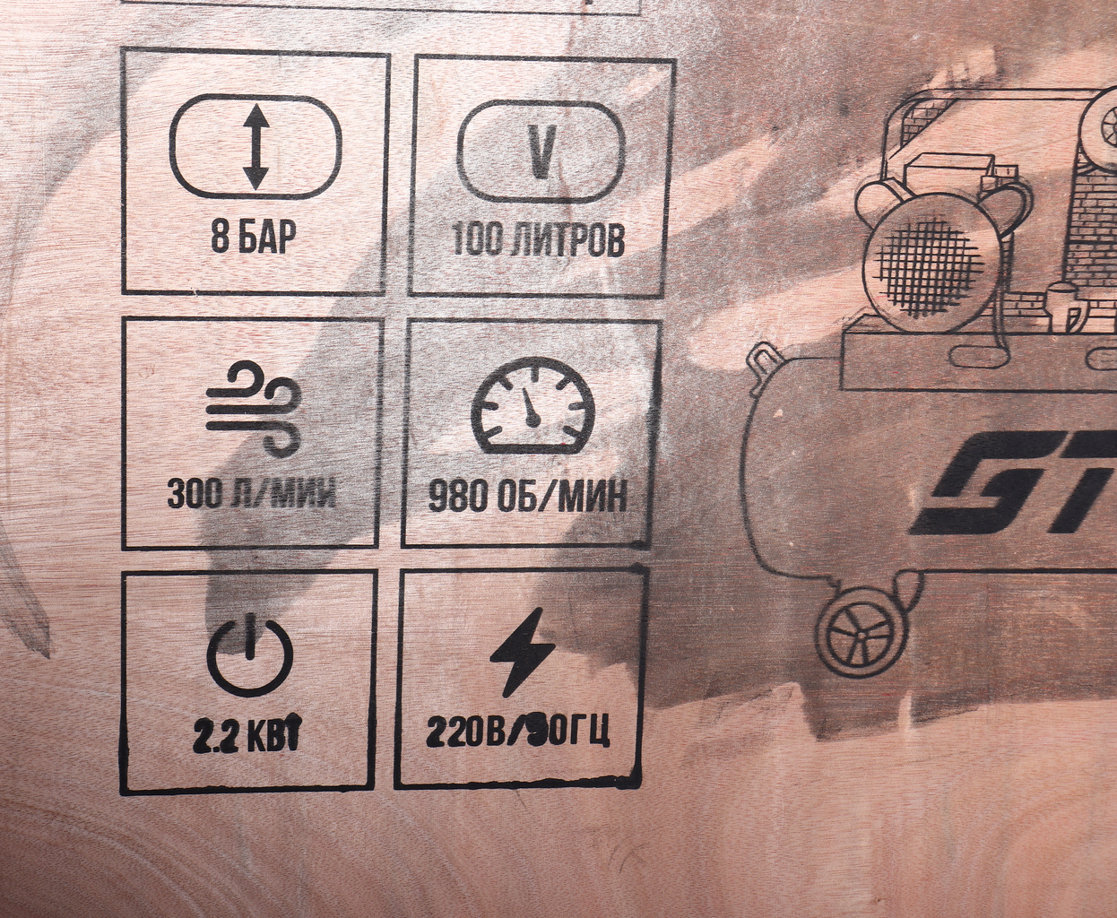 Компрессор GTE с ременным приводом — производительная модель для мастерских и автосервисов. Работает от сети 220 В, оснащён 100_литровым ресивером и выдаёт до 300 л/мин сжатого воздуха при максимальном давлении 8 атм. Мощность двигателя составляет 2,2 кВт.
