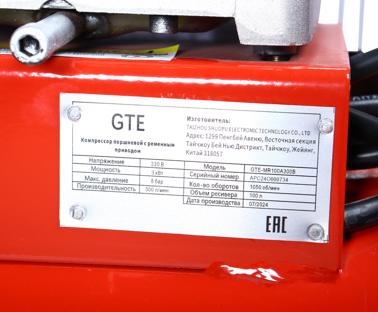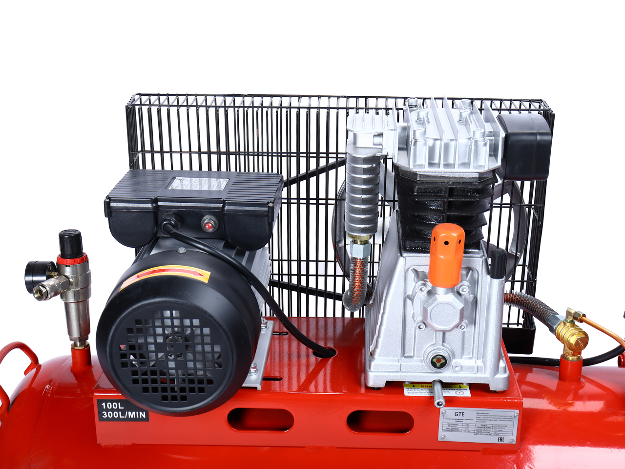 Компрессор пневматический GTE-MR100A300B с ременным приводом — надёжное решение для мастерских, автосервисов и небольших производств. Модель работает от сети 220 В, сочетает мощность 3,0 кВт с производительностью 300 л/мин и обеспечивает стабильное давление до 8 атм.