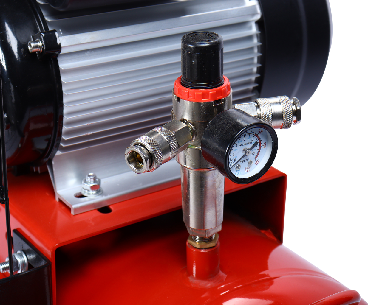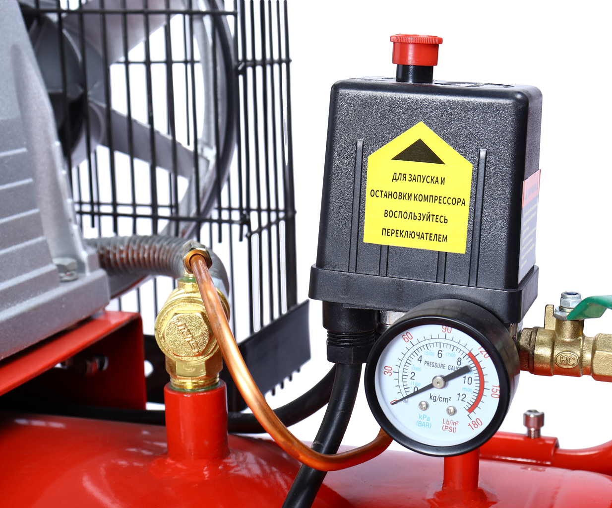 Ременная передача смягчает пусковые нагрузки и уменьшает вибрацию, делая работу компрессора более плавной и тихой. Конструкция рассчитана на интенсивную эксплуатацию: прочная сборка и продуманная система охлаждения позволяют выдерживать длительные рабочие циклы.