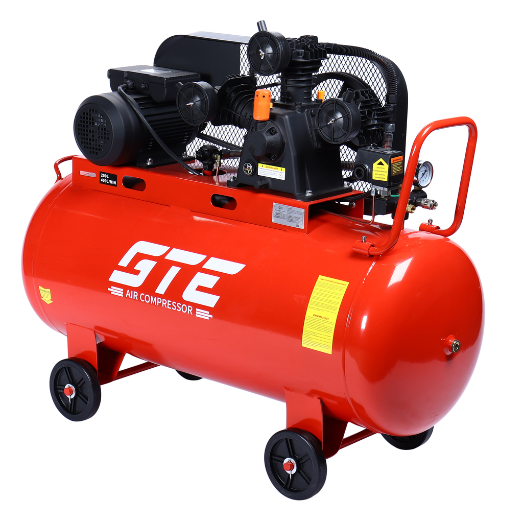 Компрессор поршневой GTE_MR4200400B с ременным приводом — производительная модель для автосервисов, шиномонтажа и мастерских. Работает от сети 220 В, сочетает мощность 3,0 кВт с производительностью 400 л/мин и обеспечивает давление до 8 атм.