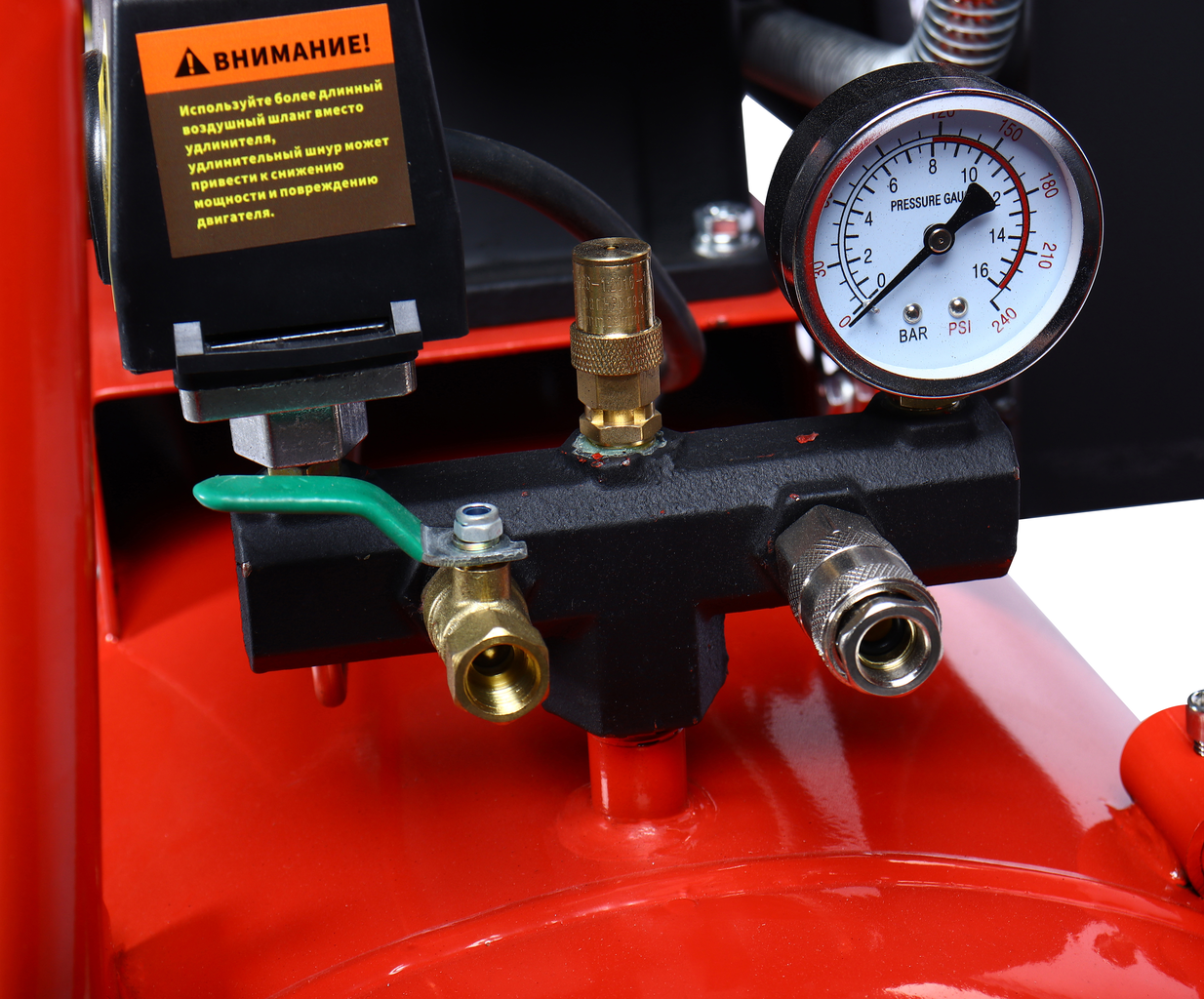 Для удобства эксплуатации предусмотрены большие колёса и ручка — компрессор легко перемещать по рабочей зоне. Два встроенных манометра позволяют контролировать давление внутри ресивера и на выходе. Ресивер имеет антикоррозийное покрытие, а защитный кожух предохраняет ременную передачу от повреждений.