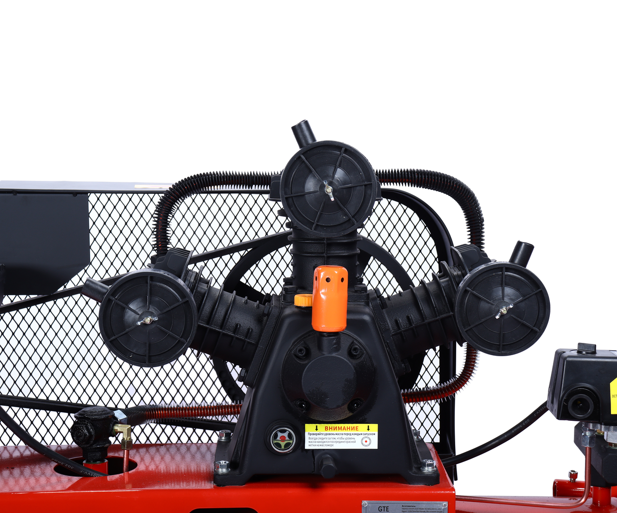 Вместительный ресивер на 200 л создаёт значительный запас сжатого воздуха, снижает частоту включений двигателя и сглаживает перепады давления. Ременной привод смягчает пусковые нагрузки, уменьшает вибрацию и продлевает ресурс агрегата. Трёхцилиндровая поршневая группа с масляной системой смазки гарантирует стабильную работу и эффективный теплоотвод даже при интенсивных нагрузках.