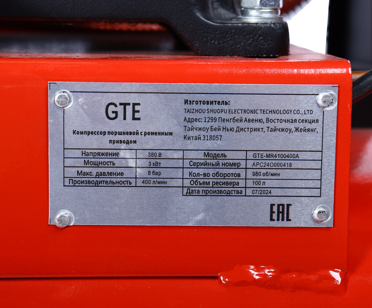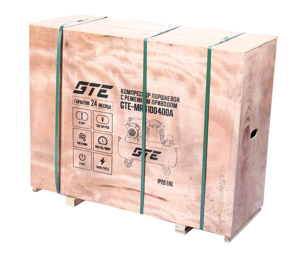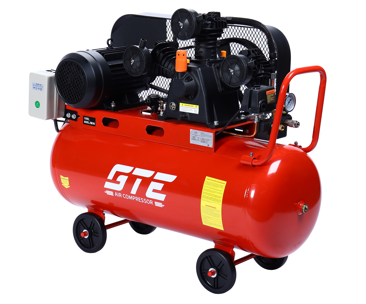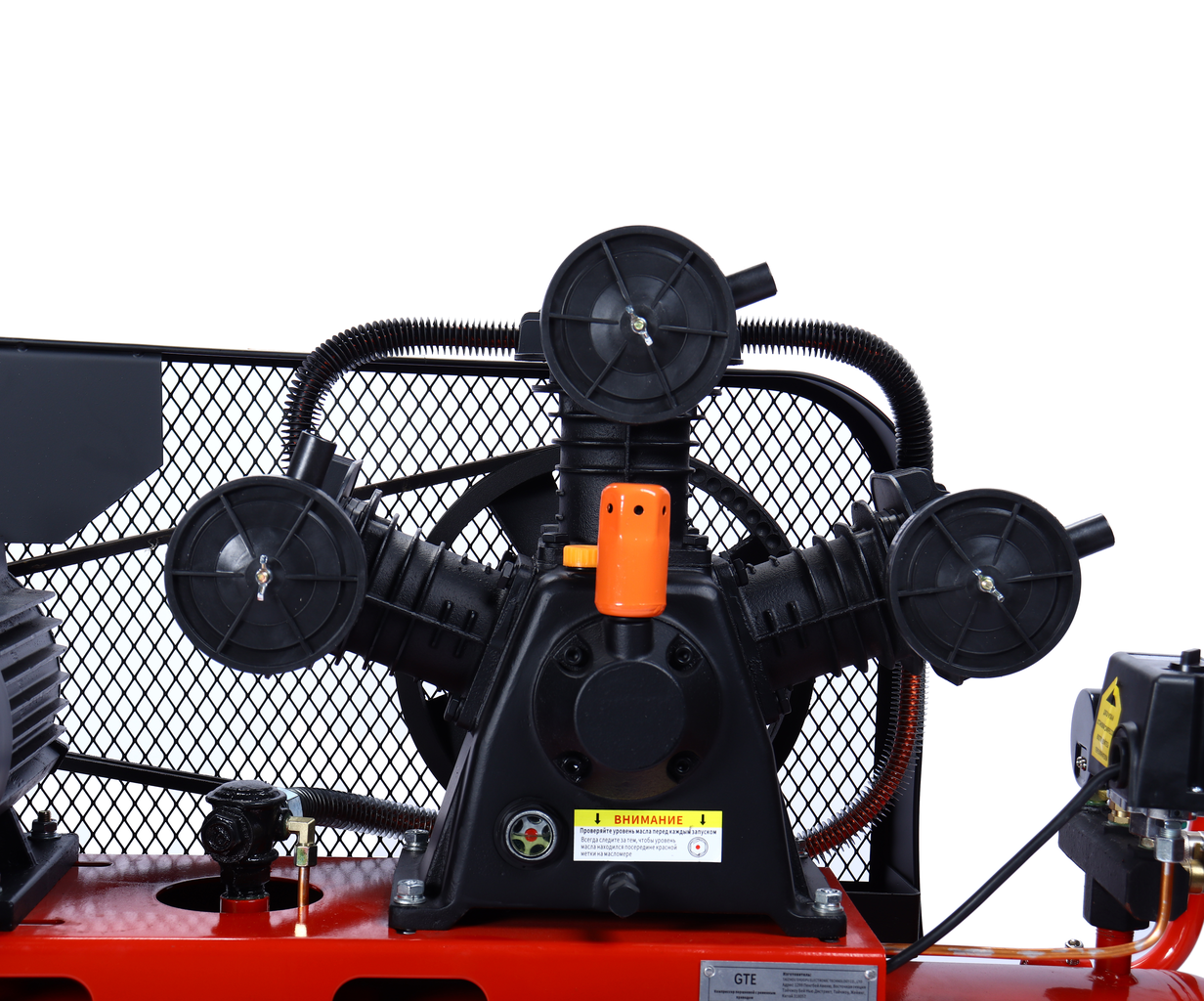 Поршневой компрессор GTE_MR4100400A с ременным приводом — производительная модель для мастерских и производств. Работает от сети 380 В, обеспечивает производительность 400 л/мин при давлении до 8 атм. Ресивер на 100 л создаёт запас сжатого воздуха, снижая нагрузку на двигатель.