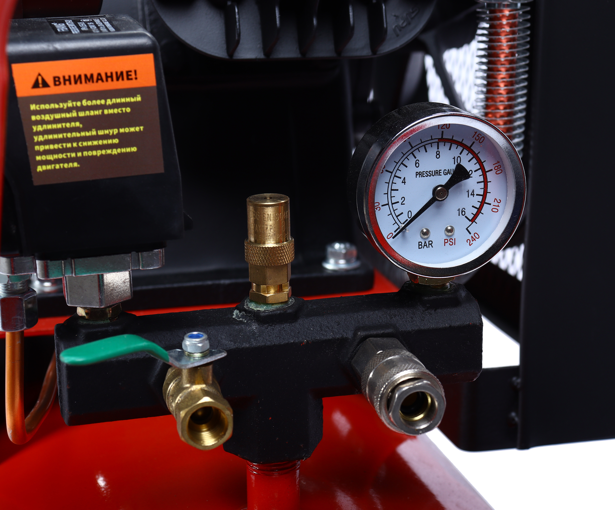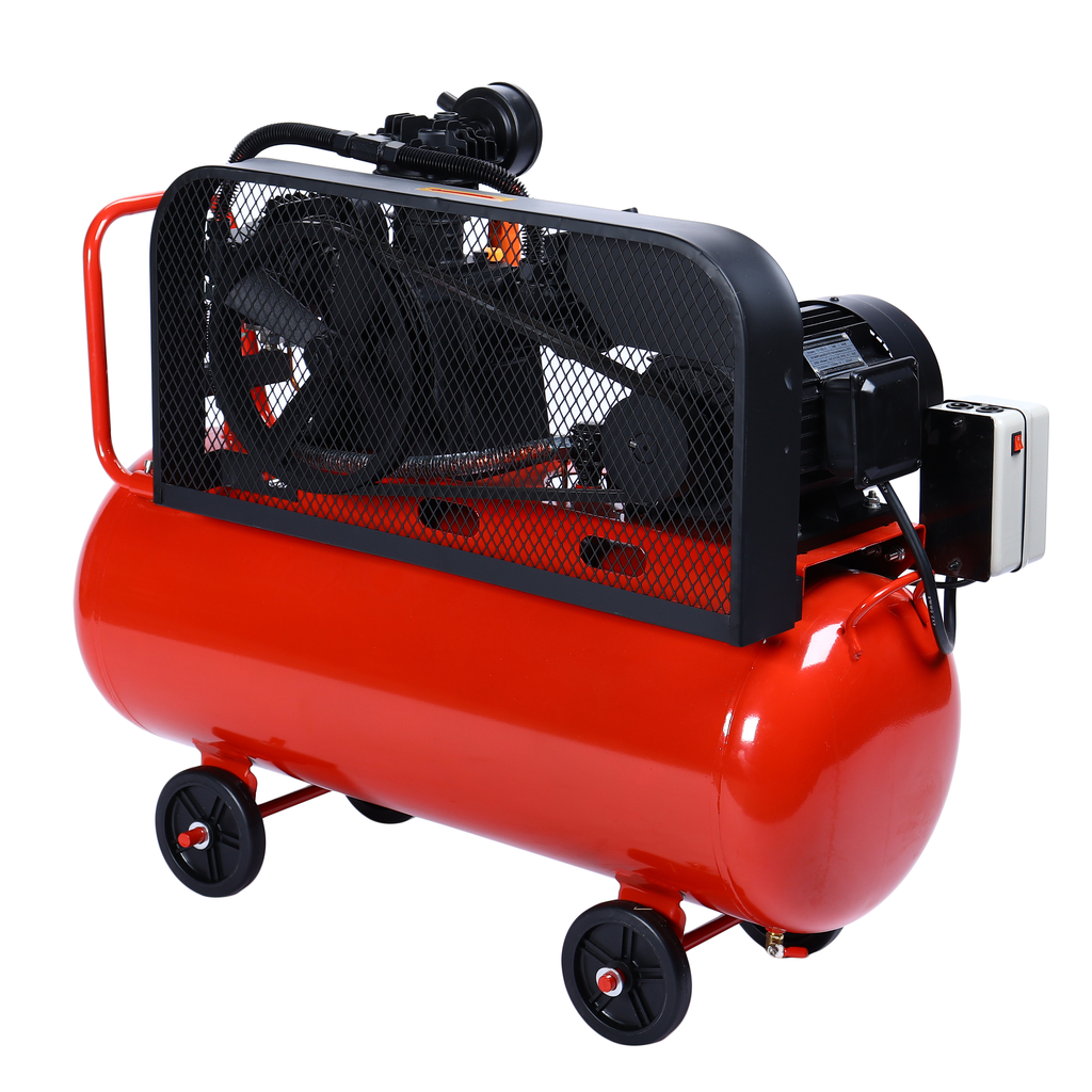 Ременная передача смягчает пусковые нагрузки и уменьшает вибрацию, повышая надёжность и срок службы. Масляная система смазки обеспечивает стабильную работу поршневой группы и эффективный теплоотвод. Конструкция включает транспортировочные колёса и ручку для удобства перемещения, а также защитные элементы — кожух ременной передачи и антикоррозийное покрытие ресивера.