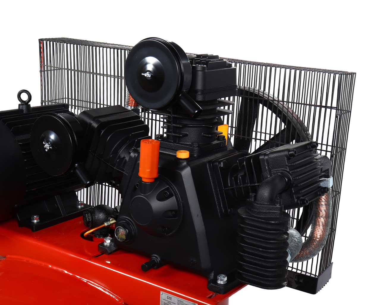 Трёхцилиндровая конструкция в сочетании с ременным приводом гарантирует плавность работы. Устройство эффективно смягчает пусковые нагрузки и гасит вибрации, благодаря чему существенно продлевается срок службы компрессора. Мощный двигатель на 7,5 кВт оснащён защитой от перегрева, что обеспечивает безопасную эксплуатацию даже при интенсивных нагрузках.
