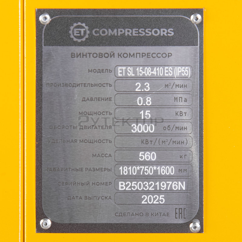 Масляный винтовой компрессор с осушителем ET SL 15-10-410 ES (IP55) с ресивером на 250 литров и прямым приводом, при мощности двигателя 15 кВт достигает производительности 2100 л/мин. Рабочее давление 10 атмосфер обеспечивает стабильное и чистое сжатие, идеально подходящее для применения в различных областях, где чистота воздуха играет ключевую роль. Страна производства: Китай.