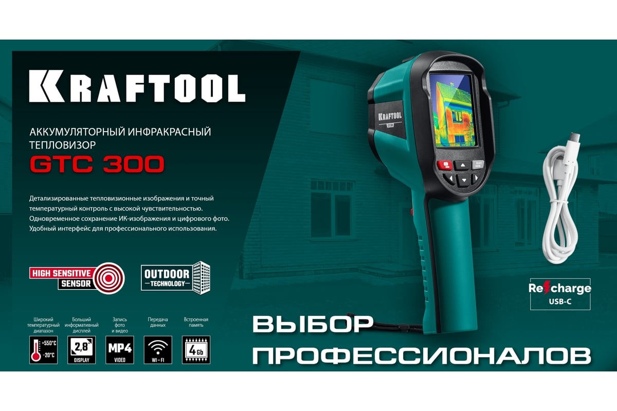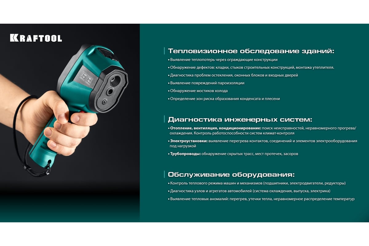 Тепловизоры KRAFTOOL обеспечивают точное обнаружение и локализацию утечек или дефектов ограждающих конструкций, незаменимы для профилактического и предупредительного обслуживания, диагностики состояния зданий, а также для исследований и разработок.
