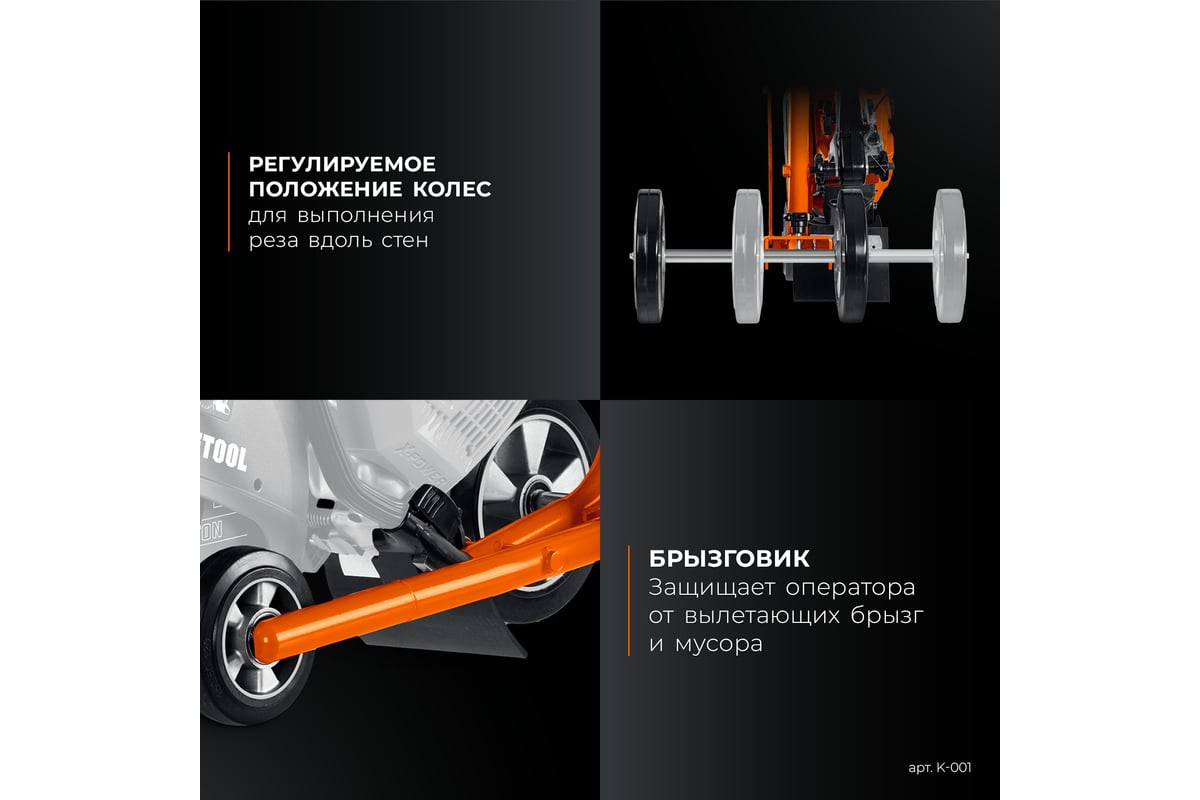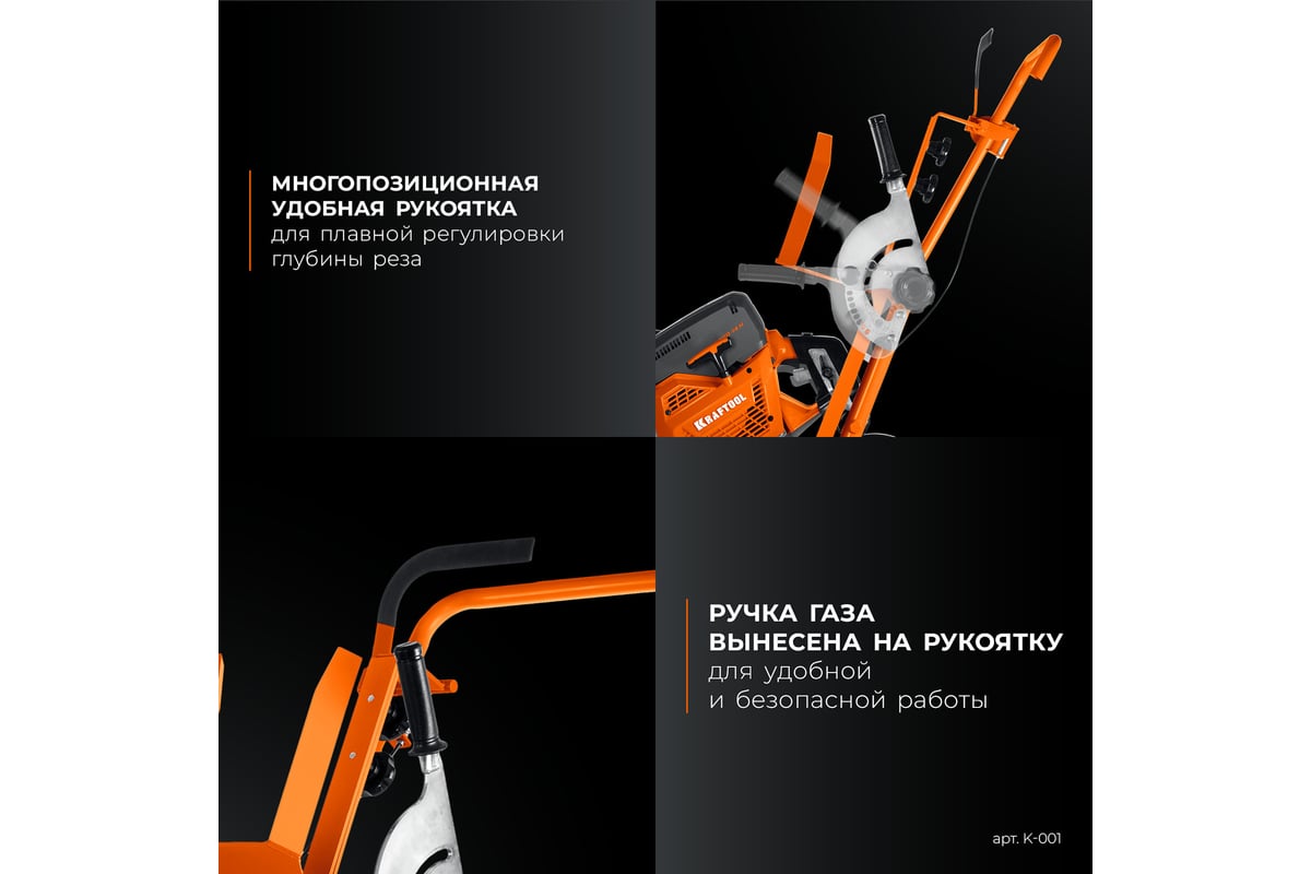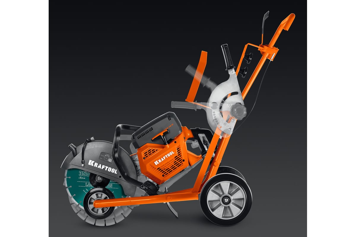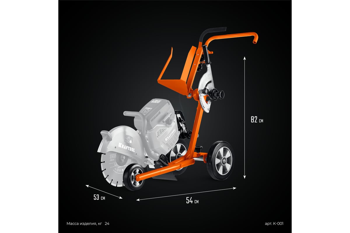 Тележка для бензореза KRAFTOOL K-001 (без бака в комплекте) предназначена для выполнения работ на плоских горизонтальных поверхностях, особенно при необходимости в длинных резах фиксированной глубины. Быстросъемные крепления позволяют легко устанавливать бензорез на тележку.
