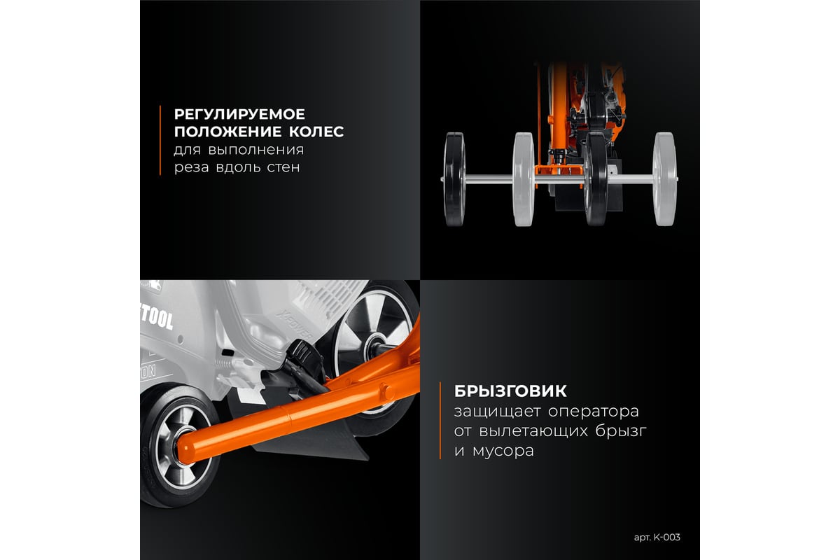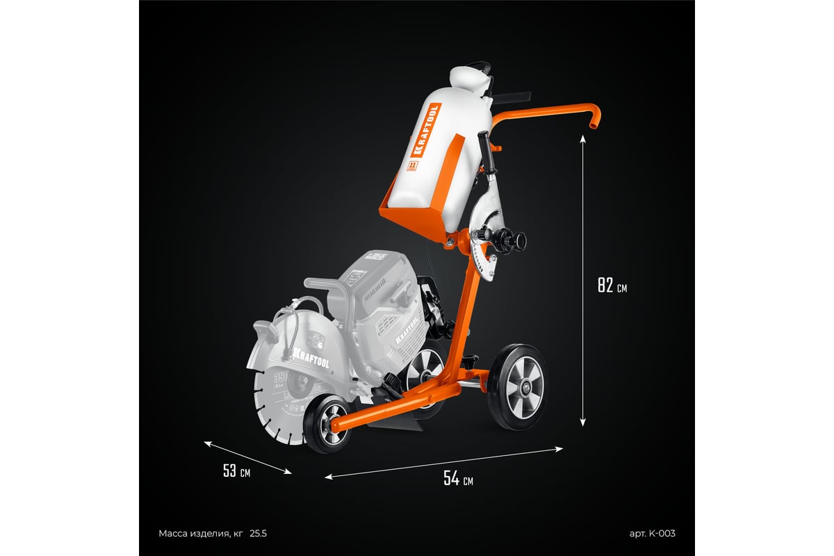 Для бензорезов Kraftool K760-14, K760-16, K770-14, K770-14 H, K770-16, K770-16 H. Применение тележки позволяет выполнять длинные ровные резы с заданной глубиной по прямой, по дуге, рядом с вертикальными поверхностями