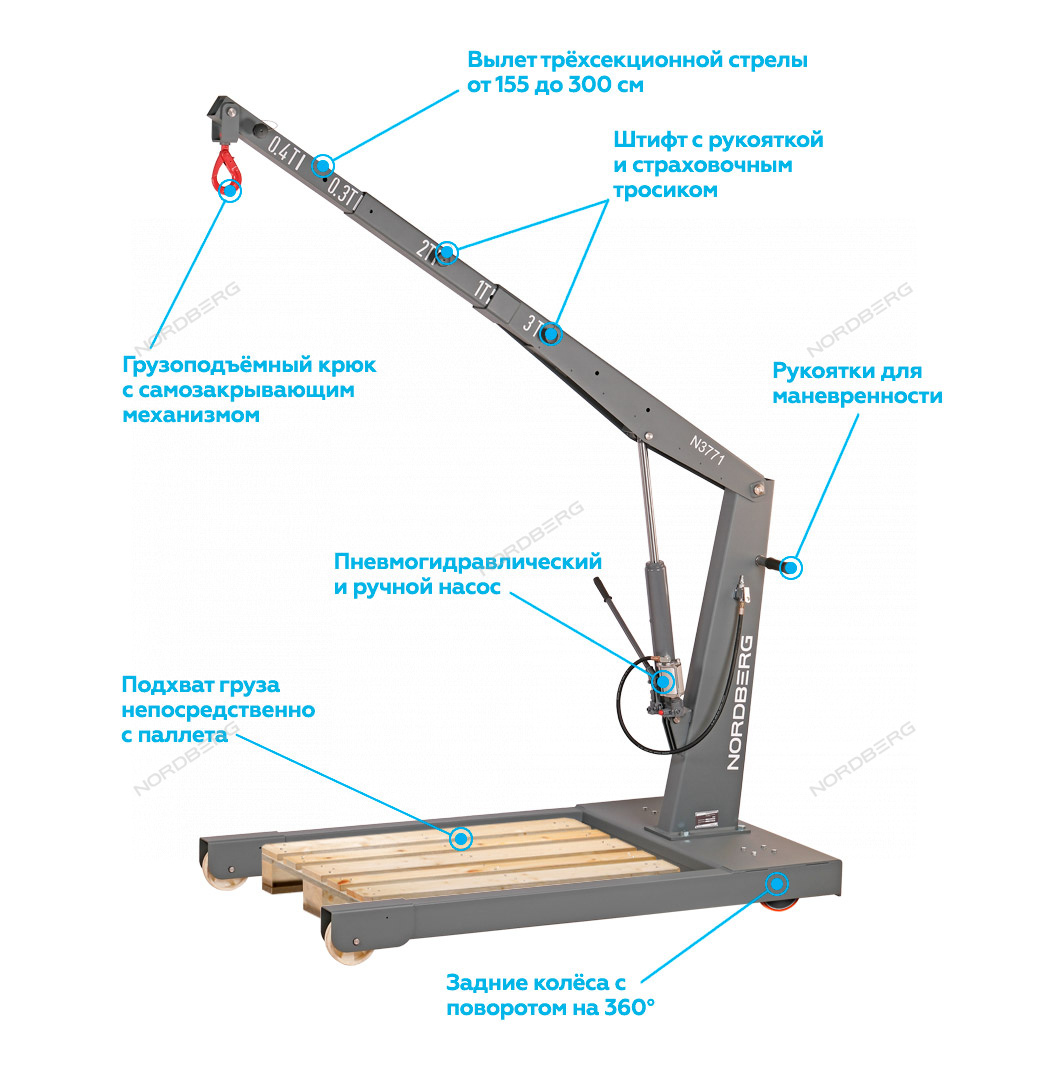 Кран гидравлический грузовой усиленный NORDBERG N3771 – профессиональное грузоподъемное оборудование для использования на СТО, в автомастерских и производственных предприятиях.