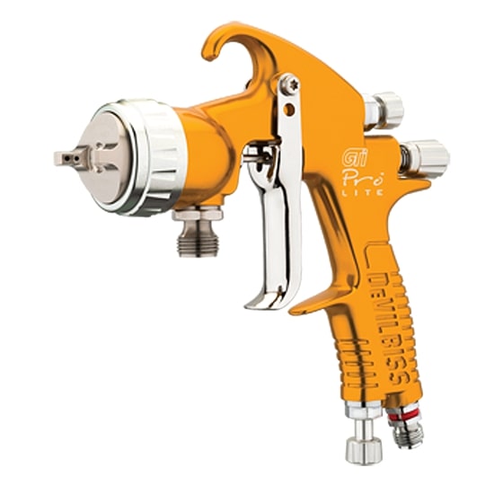 Devilbiss GTI PRO LITE с нижней подачей - это превосходные характеристики распыления, уникально большой объём потока воздуха, лёгкость и комфорт. Благодаря воздушным головам пистолеты идеальны как для выполнения небольших работ, так и для нанесения на большие поверхности. Дополнительным преимуществом является повышенная производительность. Универсальная конструкция корпуса краскораспылителя позволяет использовать его с большим количеством воздушных голов и наносить любые лакокрасочные материалы с превосходным качеством.