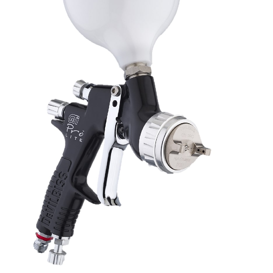 Краскораспылитель DeVILBISS GTIPRO LITE с головой HVLP TE20 для нанесения лака. Предназначен для длительной, высокопроизводительной работы. Используется в авторемонте и индустрии для нанесения финишных прозрачных покрытий (лаков).