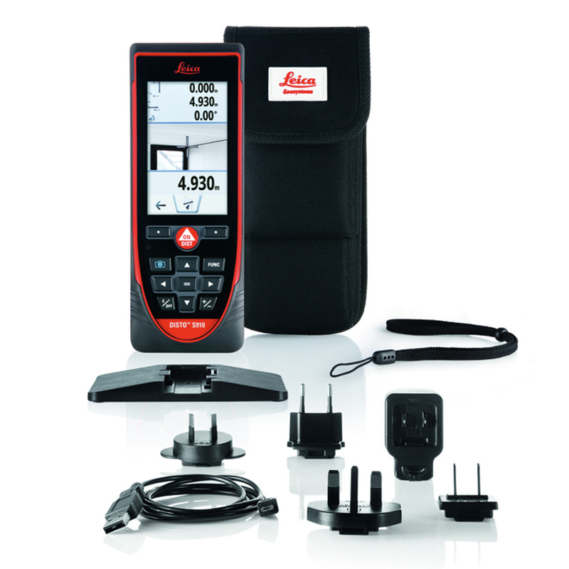 Лазерный дальномер Leica DISTO S910 с дальностью измерения 300 метров при точности ±1 мм. Для наведения на удалённую точку оснащён визиром с 4-кратным увеличением.