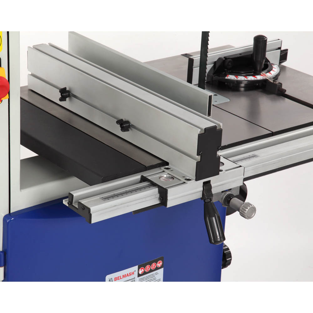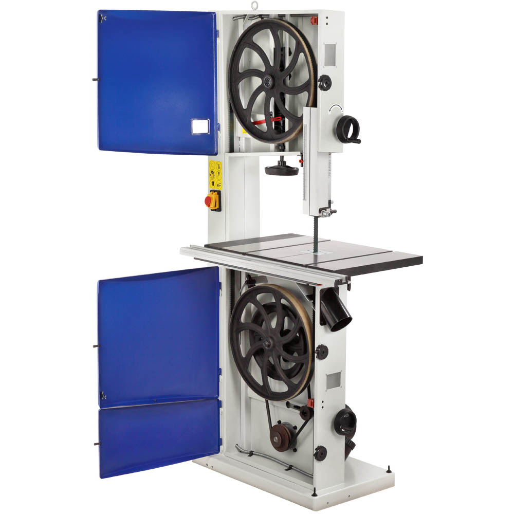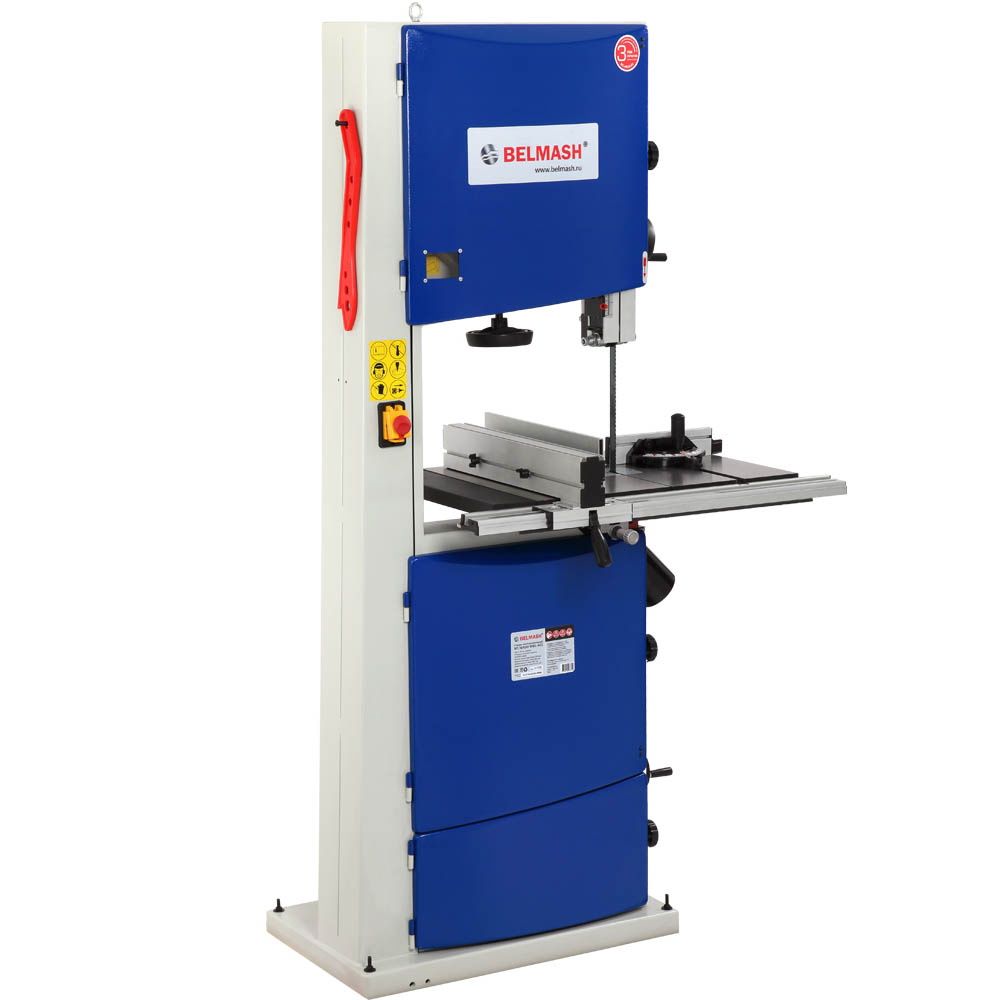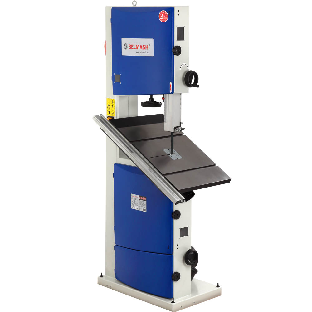 Станок напольного типа, предназначен для обработки древесины, а также, фанеры, ДВП, МДФ, ДСП и т.п. пилением с целью придания им необходимых форм и размеров, с ручной подачей заготовки. Модель комплектуется однофазным асинхронным двигателем мощностью 2200 Вт, чего с легкостью хватает для распила заготовок различных пород дерева высотой до 280 мм. Станок имеет две скорости движения пильного полотна 420 и 840 м/мин. Смена скоростей осуществляется путем перебрасывания клинового ремня на шкивах двигателя. На чугунном столе имеется два Т-образных паза, стандартным размером 19 х 9,5 мм, в который устанавливается угловой упор. На специальной направляющей закрепляется параллельный упор. Сам стол имеет угол наклона от -5 до +45 градусов. Для увеличения площади соприкосновения заготовки рабочий стол оборудован стальным расширением, общий размер рабочей поверхности составляет 730х480 мм. На станке используются пильные полотна шириной от 9,5 до 37 мм, что позволяет осуществлять как прямолинейный, так и фигурный распил. Ослабление натяжения полотна осуществляется специальным рычагом в одно движение. Для подключения аспирации станок оборудован двумя патрубками диаметром 100 мм, расположенными под рабочим столом и в нижней части основания станка. При соответствующей наладке на станке можно выполнять следующие виды обработки: