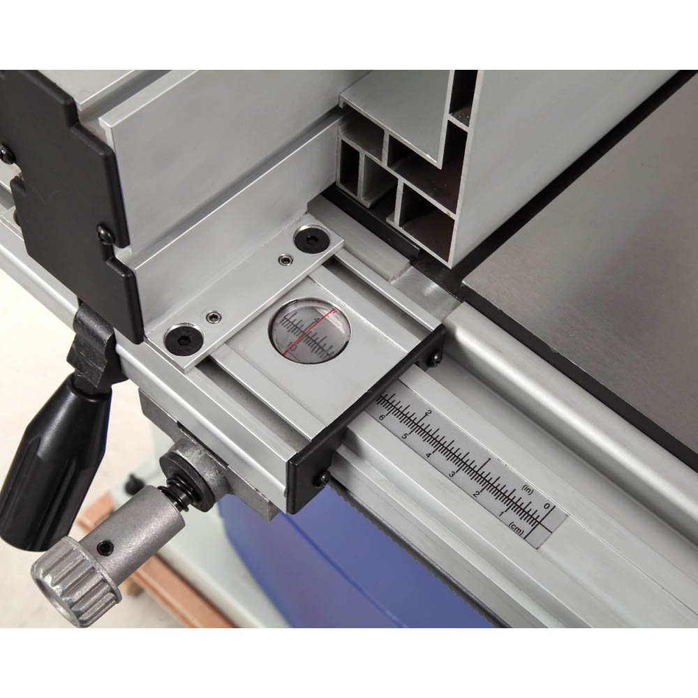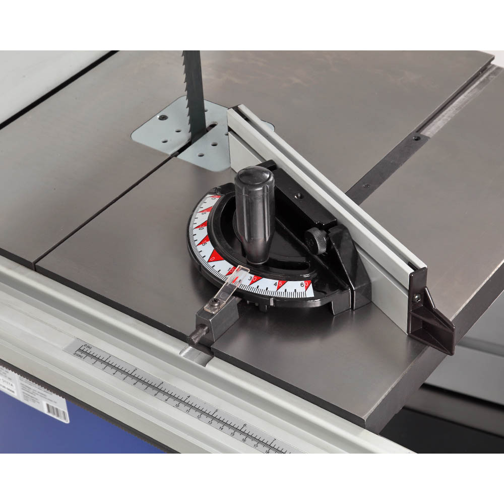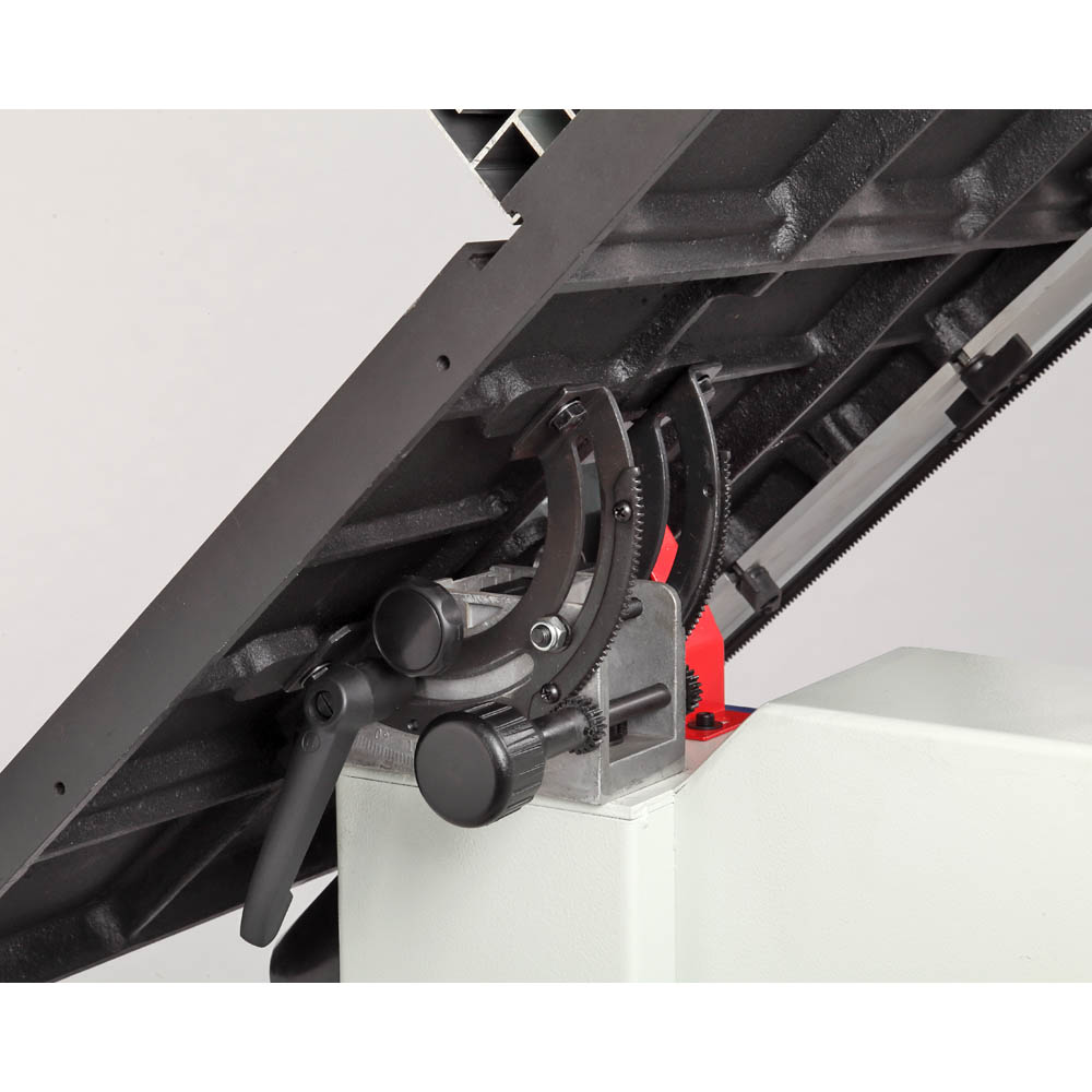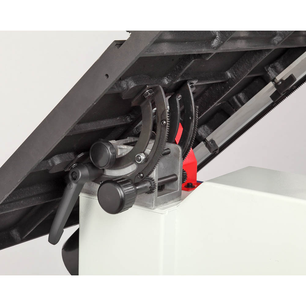 Станок напольного типа, предназначен для обработки древесины, а также, фанеры, ДВП, МДФ, ДСП и т.п. пилением с целью придания им необходимых форм и размеров, с ручной подачей заготовки. Модель комплектуется трехфазным асинхронным двигателем мощностью 2200 Вт, чего с легкостью хватает для распила заготовок различных пород дерева высотой до 280 мм. Станок имеет две скорости движения пильного полотна 420 и 840 м/мин. Смена скоростей осуществляется путем перебрасывания клинового ремня на шкивах двигателя. На чугунном столе имеется два Т-образных паза, стандартным размером 19 х 9,5 мм, в который устанавливается угловой упор. На специальной направляющей закрепляется параллельный упор. Сам стол имеет угол наклона от -5 до +45 градусов. Для увеличения площади соприкосновения заготовки рабочий стол оборудован стальным расширением, общий размер рабочей поверхности составляет 730х480 мм. На станке используются пильные полотна шириной от 9,5 до 37 мм, что позволяет осуществлять как прямолинейный, так и фигурный распил. Ослабление натяжения полотна осуществляется специальным рычагом в одно движение. Для подключения аспирации станок оборудован двумя патрубками диаметром 100 мм, расположенными под рабочим столом и в нижней части основания станка. При соответствующей наладке на станке можно выполнять следующие виды обработки: