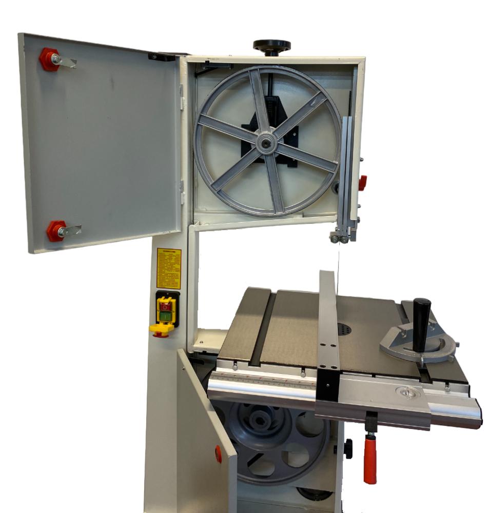 Двухскоростная ременная передача позволяет производить обработку как неплотных пород, так и твердой древесины, склонной к образованию прижогов. Двухпозиционный параллельный упор обеспечивает работу с высокими заготовками при перпендикулярном резе и с плоскими деталями при пилении с наклоном. Направляющие подшипники ленты служат для обеспечения дополнительной точности и длительного срока службы. Станок оснащен двумя защитными выключателями для его остановки, если открыть верхнюю или нижнюю дверцу во время работы.