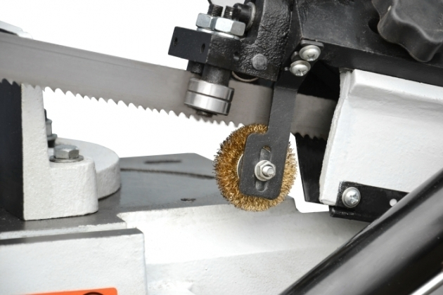 - Станок оборудован очищающими щётками, которые обеспечивают удаление стружки с двигающейся пильной ленты.