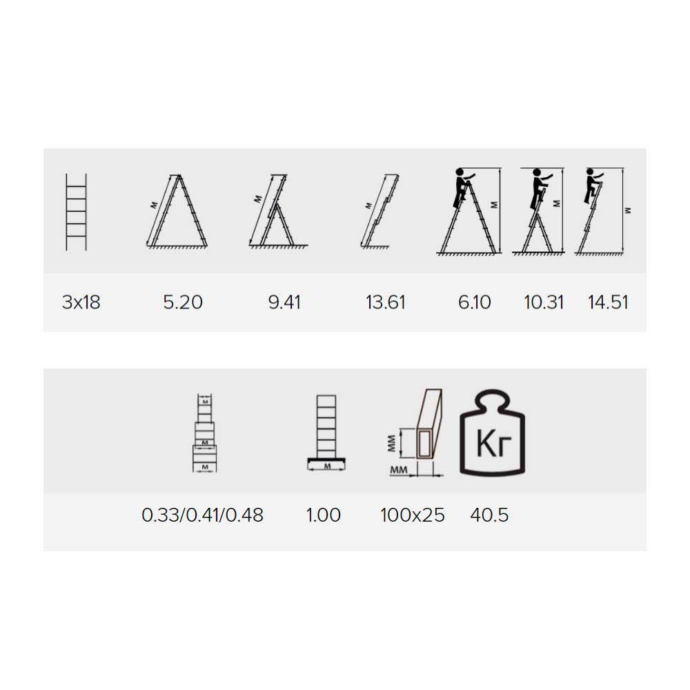 Универсальная трехсекционная лестница Алюмет с 18 ступенями предназначена для работы на высоте от 6,10 м до 14,51 м. Ширина ступеней 33/41/48 см позволяет легко спускаться и подниматься. Изделие может использоваться как стремянка и в положении приставной односекционной лестницы. Толстый алюминиевый профиль выдерживает статическую нагрузку до 150 кг.