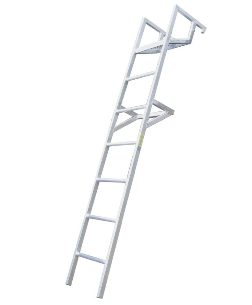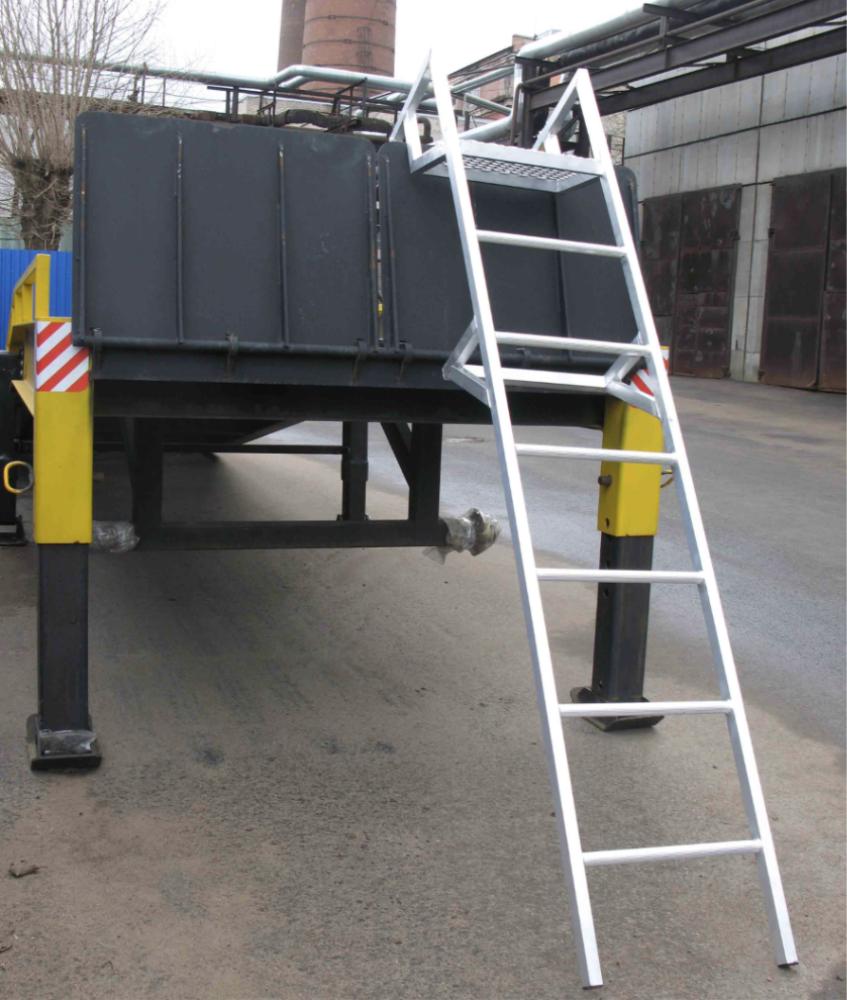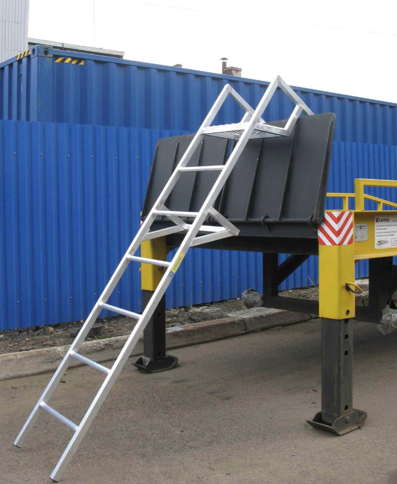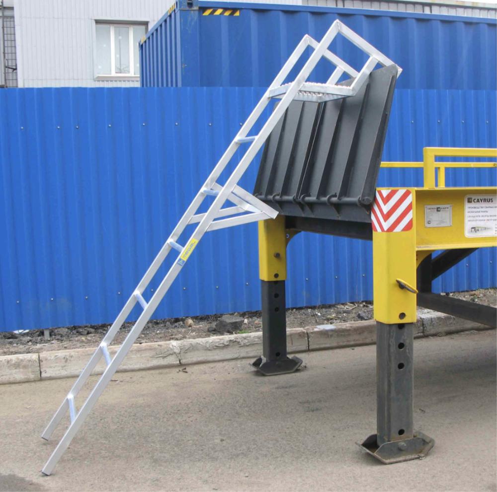 Соединения ступеней и тетивы, выполненные посредством аргонно-дуговой сварки, увеличивают надежность и долговечность лестницы. Ступени шириной 45 см, выполненные из рифленого профиля, обеспечивают безопасный и удобный подъем и спуск. Конструктив зацепов позволяет надежно фиксировать лестницу на борту КАМАЗа. Площадка из просечно-вытяжного листа обеспечивает безопасное размещение работника.