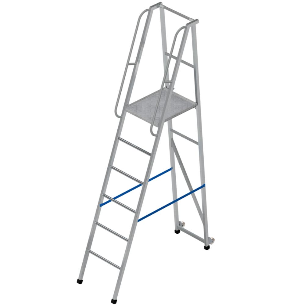Лестница-платформа фиксированной высоты алюминиевая MEGAL ЛПФВА Н=1.0-3 передвижная предназначена для подъема, организации рабочего места при досмотре автотранспорта, строительных, монтажных, складских работах. Представляет собой легкую складную конструкция из алюминиевых профилей высокой прочности. Имеет безопасные ступени из специального рифленого профиля. Колеса в основании позволяют легко транспортировать лестницу. Все соединительные узлы и элементы полностью безопасны, обработаны и одобрены службой контроля качества. Площадка размером 600х500мм позволяет удобно расположиться рабочему с необходимым инструментом. Противоскользящая поверхность площадки изготовлена из рифленого алюминиевого листа «квинтет». Лестница оснащена поручнями и ограждением высотой 1,1м для безопасного подъема, спуска и проведения работ. Складная конструкция позволяет удобно эксплуатировать, транспортировать и хранить лестницу.