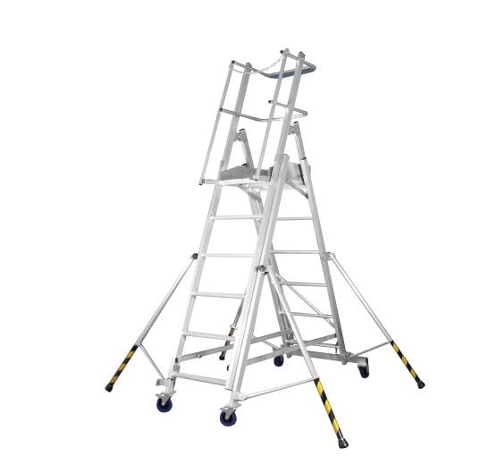 Лестница - платформа телескопическая MEGAL ТЛП (1,9 - 3,3) представляет собой безопасную и легкую конструкцию из алюминиевых профилей высокой прочности. Предназначена для работ в торговых залах, на складах, вдоль стеллажей и других объектов, при проведении ремонтных, монтажных и иных работ на возвышении. Лестница имеет легкий вес за счет использования алюминиевых сплавов. Лестница имеет регулируемый диапазон рабочих высот за счет изменения высоты рабочей площадки. Трехстороннее ограждение площадки со встроенной защитной планкой в районе колен, бортовое ограждение, ступени из рифленой трубы обеспечивают безопасный подъем, спуск и проведение работ. Заход на площадку имеет съемную цепочку. Площадка размером 680х510мм позволяет удобно расположиться рабочему с необходимым инструментом. Складная конструкция позволяет осуществлять простую и быструю сборку. Небольшая занимаемая площадь и прочные поворотные колеса со стопорами позволяют легко маневрировать в ограниченном пространстве.