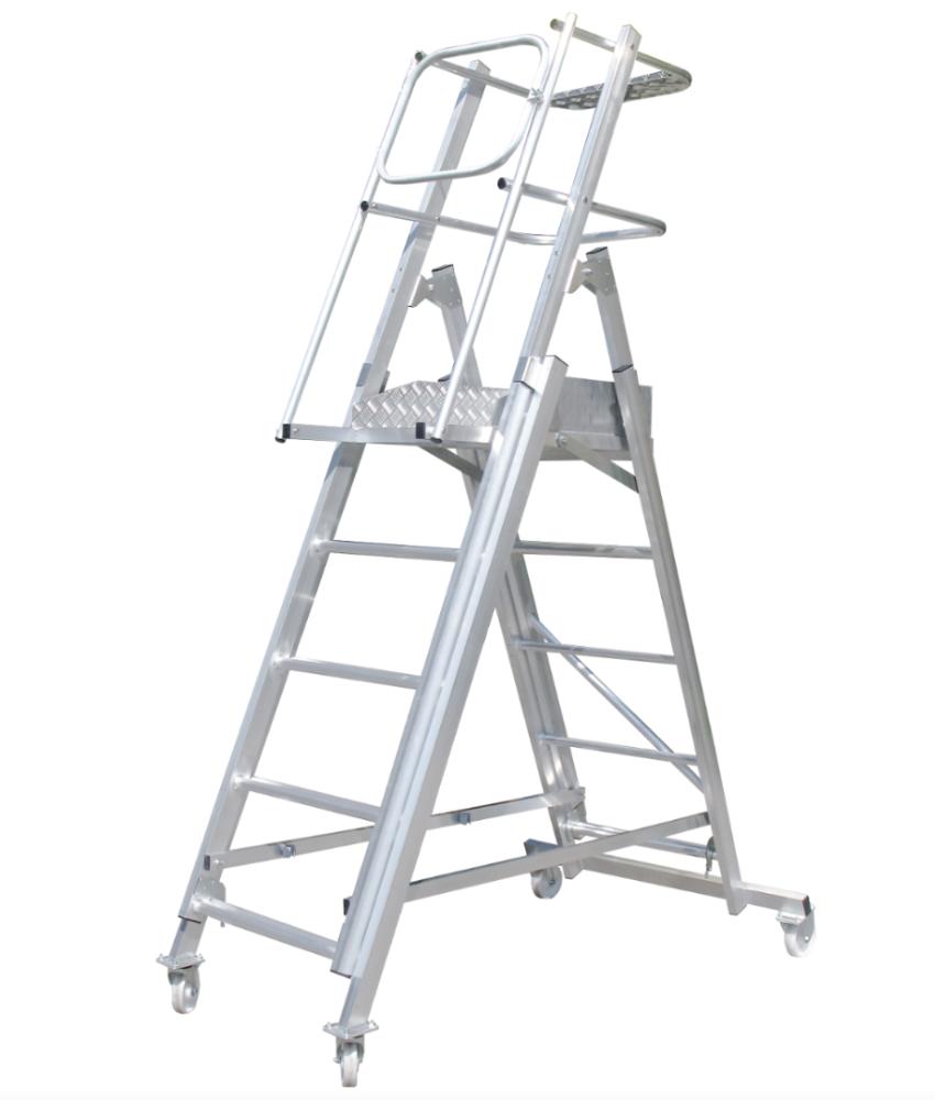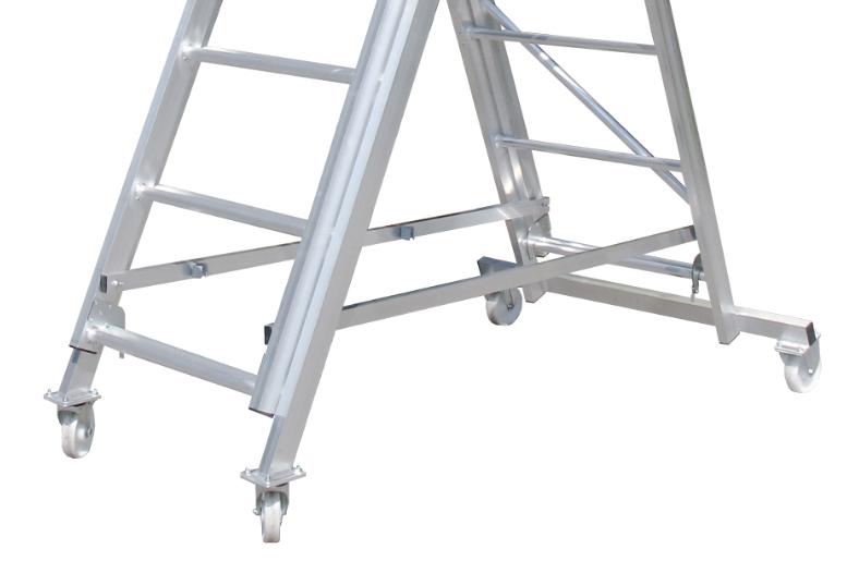 Лестница - платформа телескопическая MEGAL ТЛП-К (1,3 - 1,9) представляет собой безопасную и легкую конструкцию из алюминиевых профилей высокой прочности. Предназначена для работ в торговых залах, на складах, вдоль стеллажей и других объектов, при проведении ремонтных, монтажных и иных работ на возвышении. Лестница имеет легкий вес за счет использования алюминиевых сплавов. Лестница имеет регулируемый диапазон рабочих высот за счет изменения высоты рабочей площадки. Трехстороннее ограждение площадки со встроенной защитной планкой в районе колен, бортовое ограждение, ступени из рифленой трубы обеспечивают безопасный подъем, спуск и проведение работ. Заход на площадку закрывается калиткой. Площадка размером 680х510мм позволяет удобно расположиться рабочему с необходимым инструментом. Складная конструкция позволяет осуществлять простую и быструю сборку. Небольшая занимаемая площадь и прочные поворотные колеса со стопорами позволяют легко маневрировать в ограниченном пространстве.