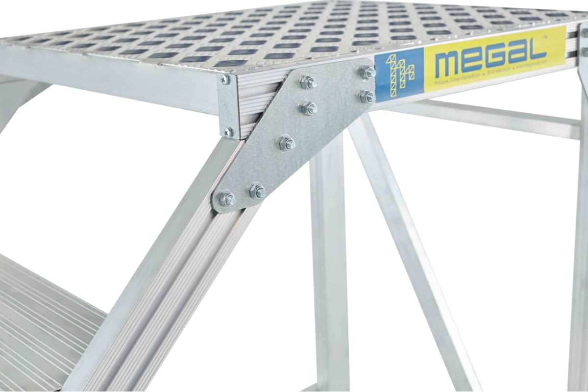 Лестница подмости MEGAL ЛП-0,8 применяются при выполнении монтажных, сервисных и т.п. работах на небольшой высоте. Ножки подмостей укомплектованы резиновыми противоскользящими башмаками и комплектом колес. Существует возможность установки поручней для лестницы – подмостей.