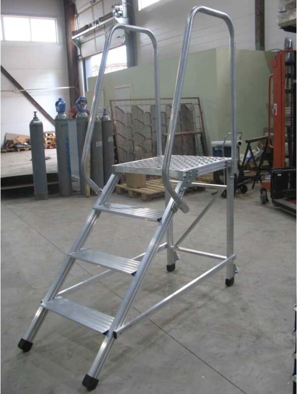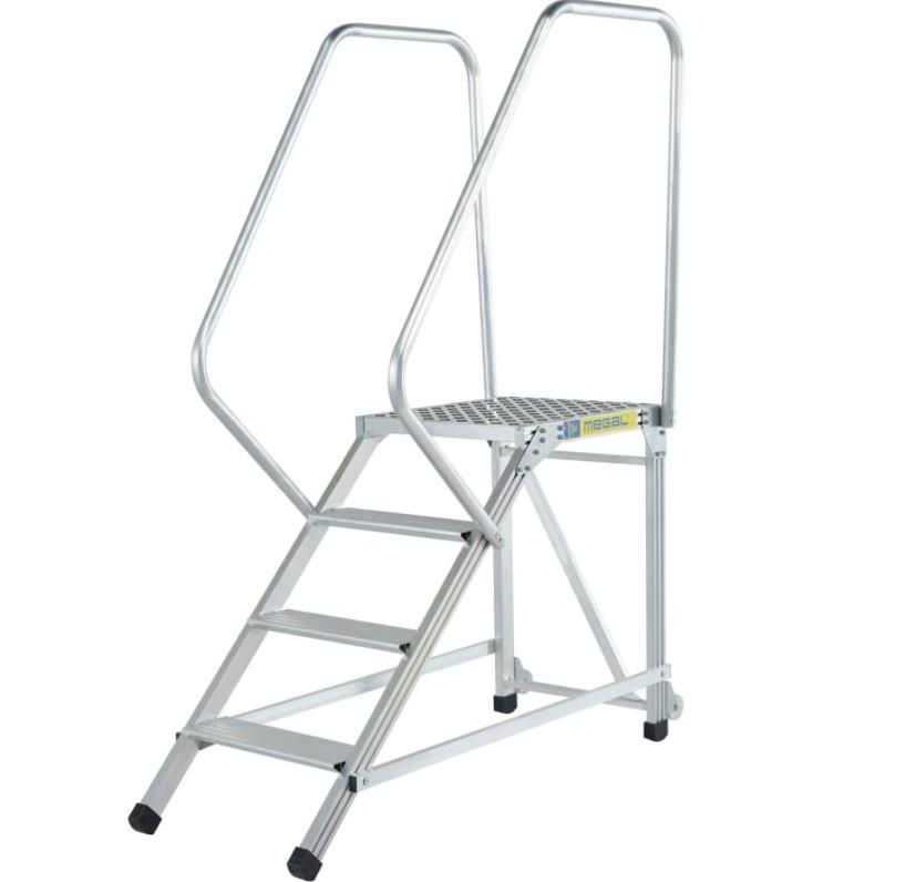 Лестница подмости MEGAL ЛП-0,8 с двумя поручнями используется при выполнении монтажных, сервисных и других работ на небольших высотах. Широкие ступени глубиной 160 мм из специального рифленого профиля для безопасности подъема и комфорта в работе. Верхняя площадка размером - 0,600х0,675 м. Наклонный лестничный марш под углом 45 градусов. Для удобства подъема подмости оснащены двумя поручнями. Высокая грузоподъемность обеспечивается за счет использования труб и профилей со стенкой не менее 2,5мм. Ножки подмостей имеют резиновые противоскользящие башмаки. Для удобства перемещения подмости оснащены колесами.