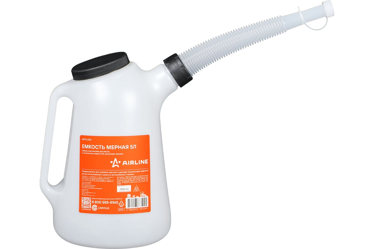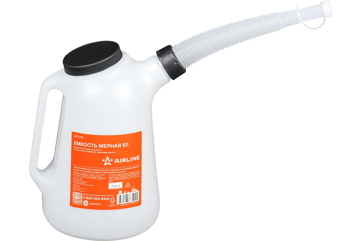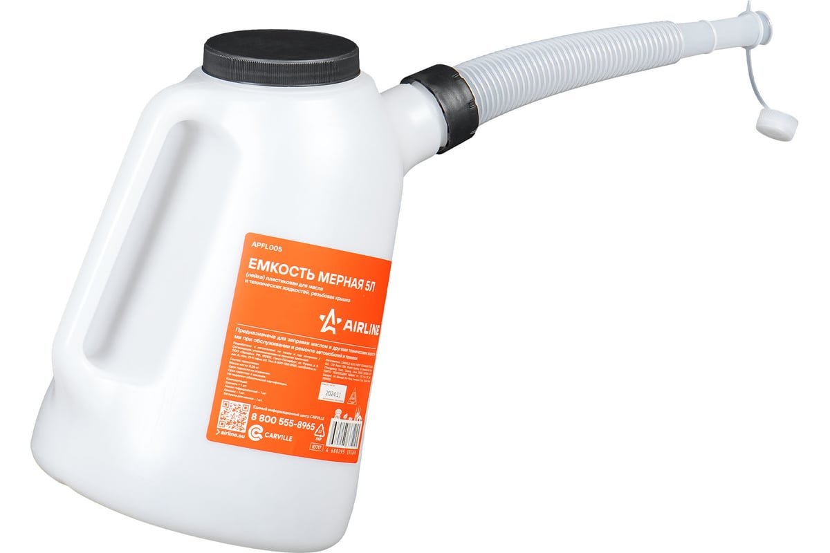 Емкость (лейка) мерная 5л пластиковая AIRLINE APFL005 предназначена для заправки маслом и другими техническими жидкостями при обслуживании и ремонте автомобилей и техники. Изделие имеет гофрированный гибкий носик для заправки. На конце носика находится специальный клапан. Крышка с резьбовой фиксацией защищает жидкость внутри лейки от попадания частиц пыли и мусора.