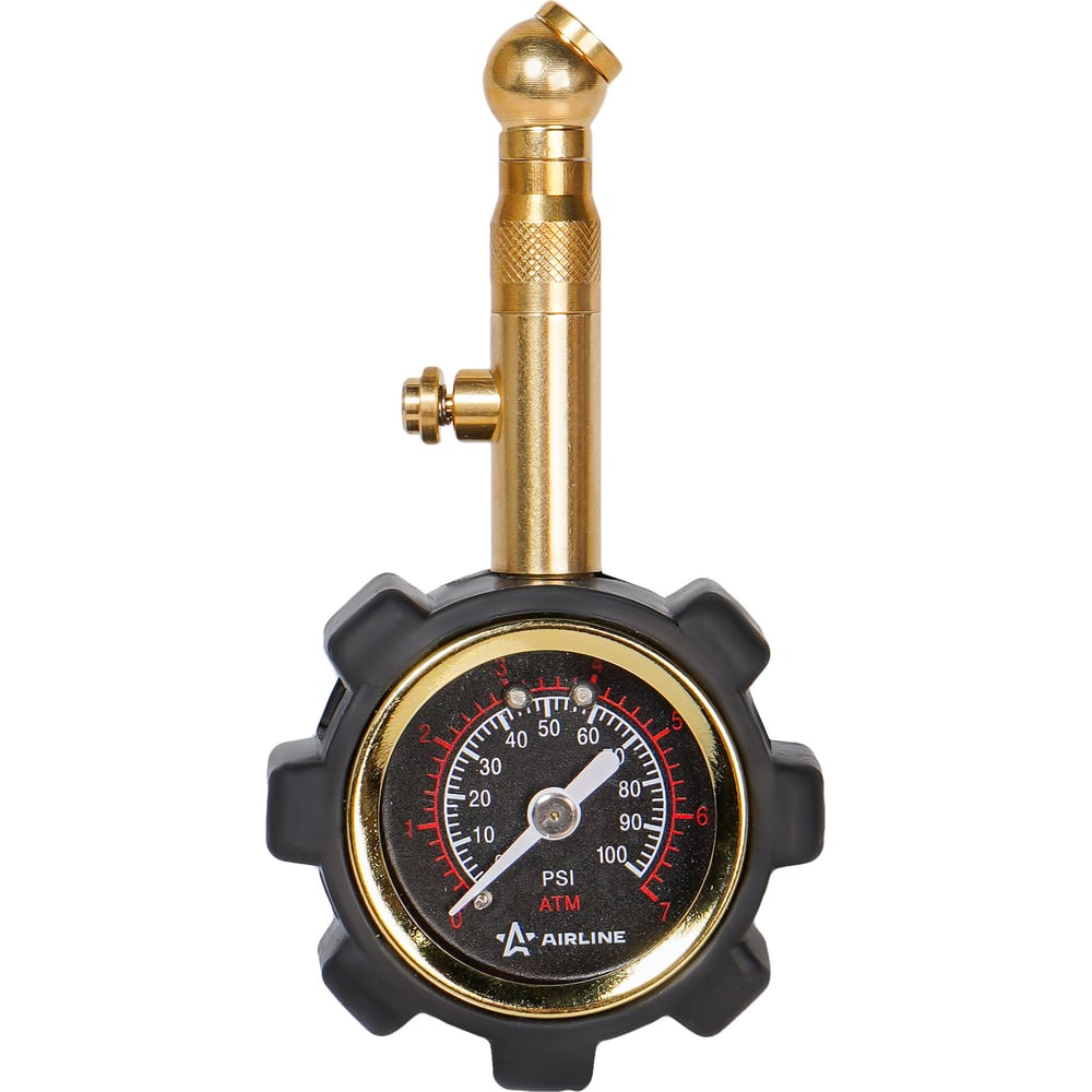 Стрелочный манометр Airline PRO 7АТМ, 40 мм, с клапаном сброса AEAS001 служит для измерения давления в шинах автомобиля. Имеет прочный металлический корпус, защищённый резиновым чехлом. На корпусе присутствует клапан для сброса лишнего давления в шине. При измерении давления показания манометра фиксируются - это удобно при работе в труднодоступных местах.