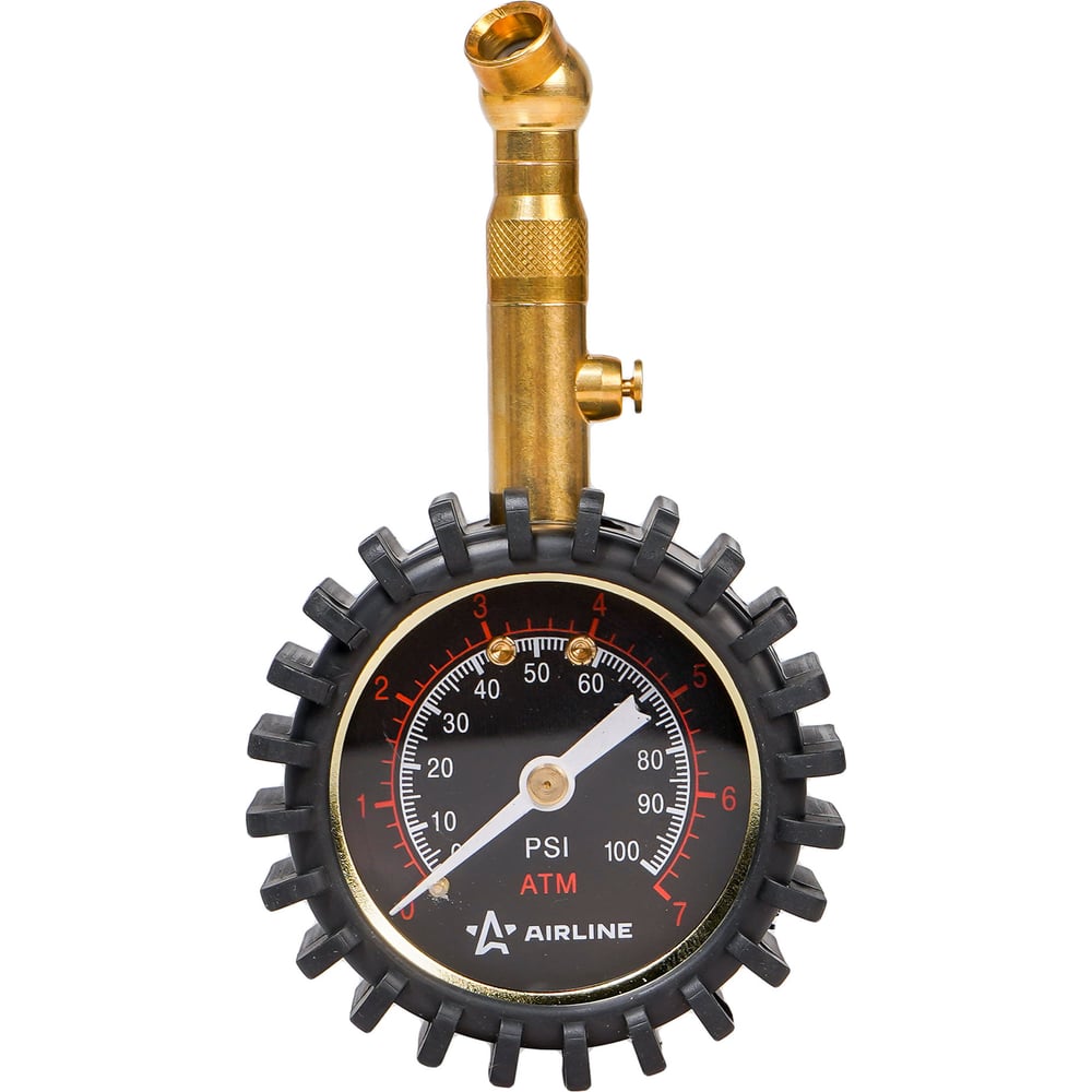 Стрелочный манометр Airline PRO 7АТМ, 50 мм, с клапаном сброса AEAS002 служит для измерения давления в шинах автомобиля. Имеет прочный металлический корпус, защищённый резиновым чехлом. На корпусе присутствует клапан для сброса лишнего давления в шине. При измерении давления показания манометра фиксируются - это удобно при работе в труднодоступных местах. Для сброса показаний необходимо нажать на кнопку клапана сброса.