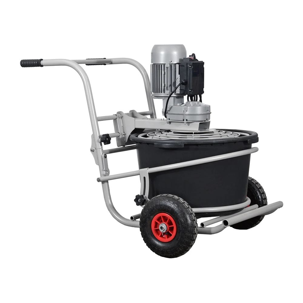 Миксерная установка БЕЛМАШ MS-6502 – это автономный универсальный миксер, предназначенный для замешивания строительных смесей и растворов (цементных смесей плиточного клея, краски, эпоксидного клея и т. п.). Установка состоит из тележки, на которой установлен поворотный кронштейн с мотор-редуктором и ёмкости для смешивания. Двигатель асинхронный со встроенным редуктором и защитой от перегрева. Он работает на низких оборотах, что позволяет не захватывать воздух при смешивании. В результате получается однородная смесь отличного качества в большом объёме. Установка оборудована пневматическими колёсами. Для безопасности предусмотрено отключение аппарата при подъёме крышки. Венчик изготовлен из стальной гнутой трубы диаметром 20 мм.
