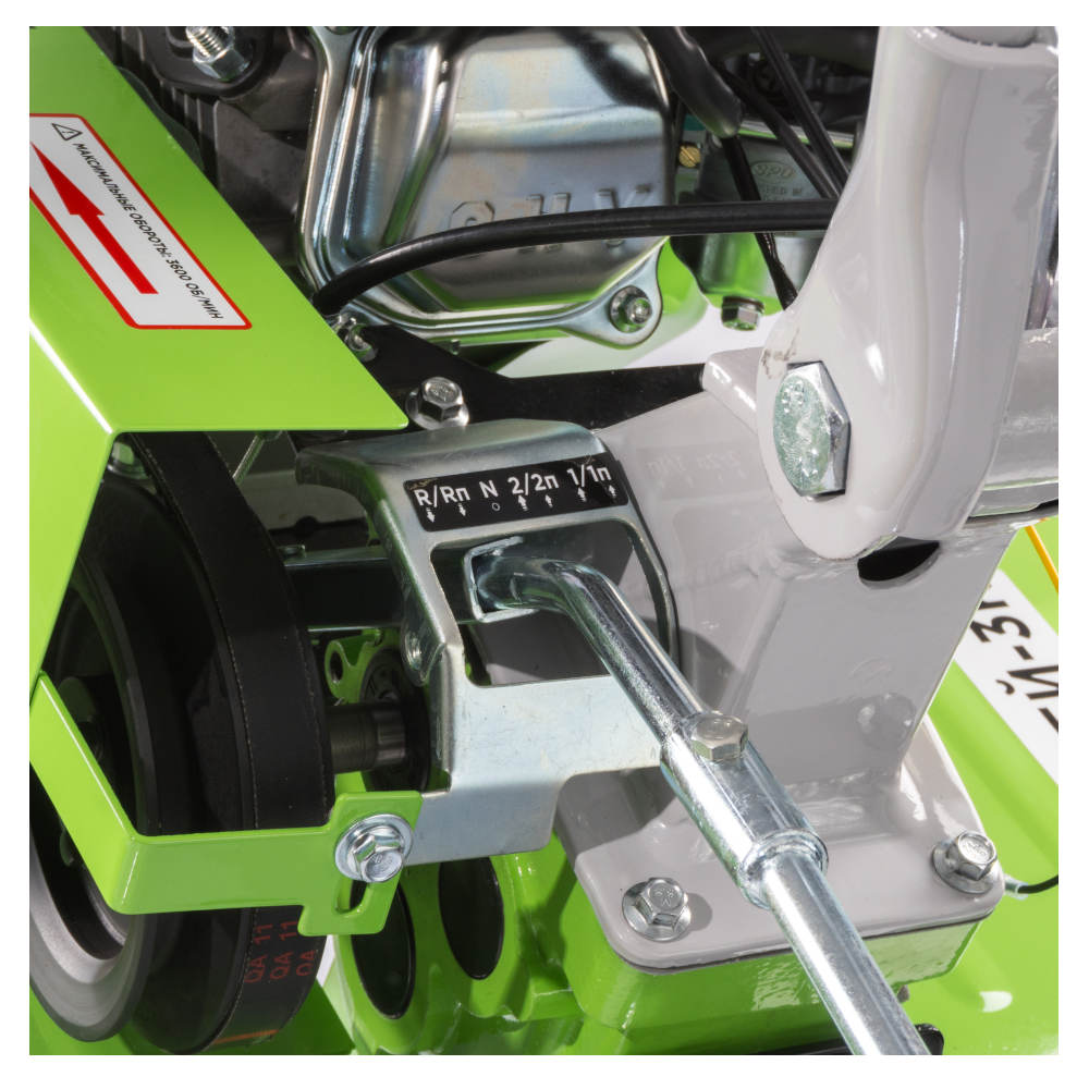 - Возможность переключения скоростей 4 вперёд, 2 назад - позволяет не только эффективно работать на разном грунте, но и легко извлекать мотоблок из вязкой почвы