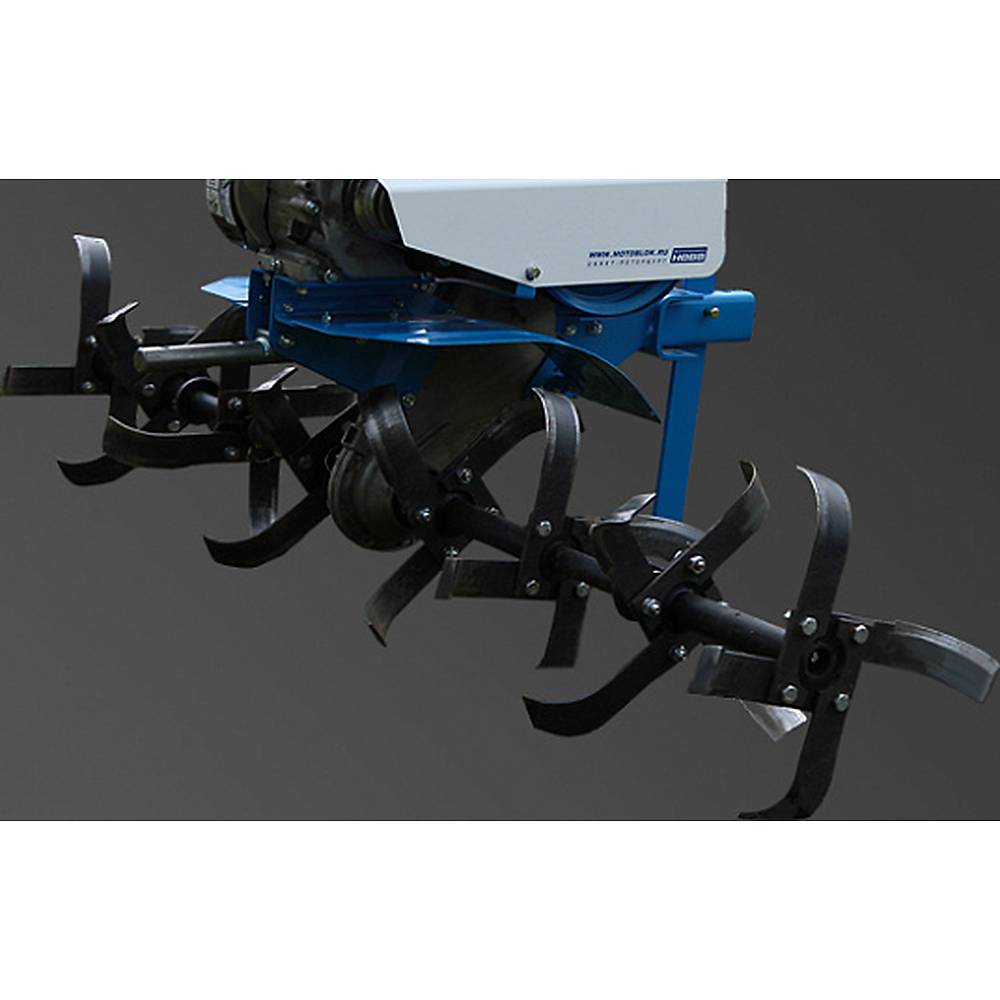 Передача вращения на навесное оборудование осуществляется с помощью ремня. Рекомендуемый диаметр фрез — 36 см. Максимальная глубина вспашки — 20 см. Мотоблок поставляется с большими пневматическими колесами. Рельефный узор протектора обеспечивает высокую проходимость.