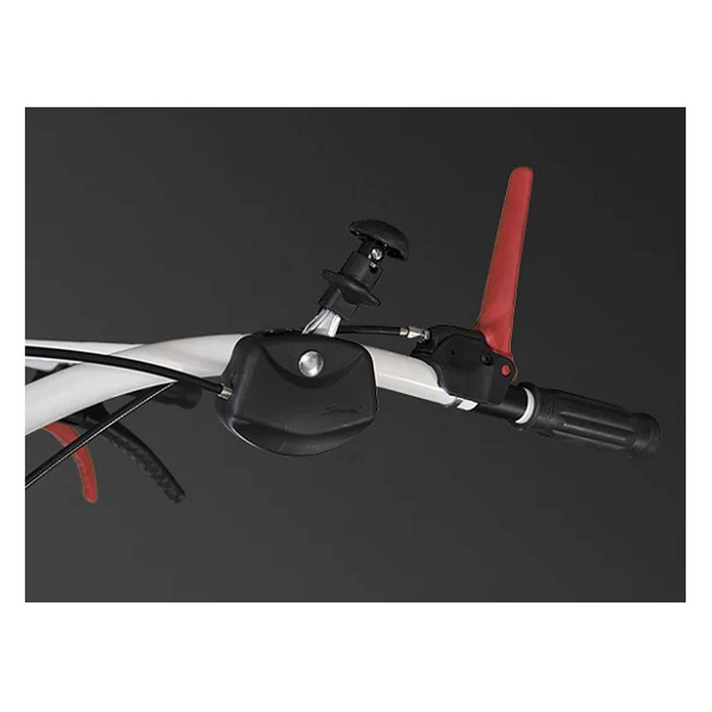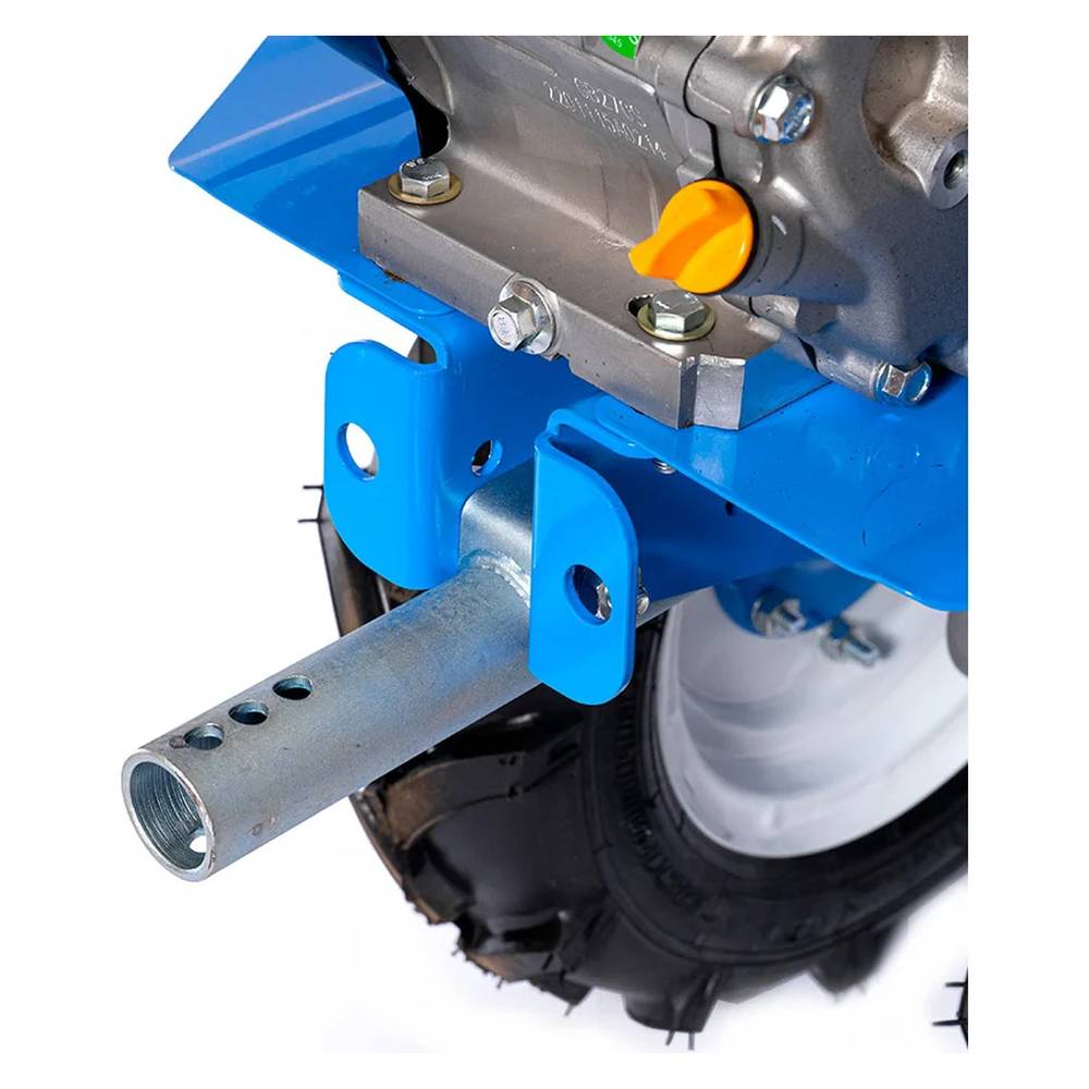 Передача вращения на навесное оборудование осуществляется с помощью ремня. Ширина обработки земли с фрезами составляет 86-127 см, глубина — до 20 см. В комплекте к мотоблоку есть широкие пневматические колеса. Рельефный узор протектора шин обеспечивает хорошую проходимость техники на неровных участках.