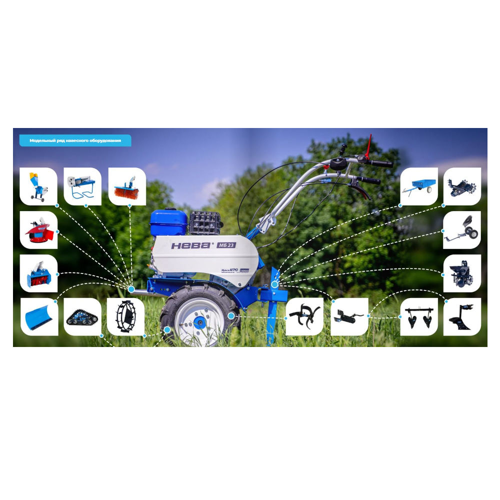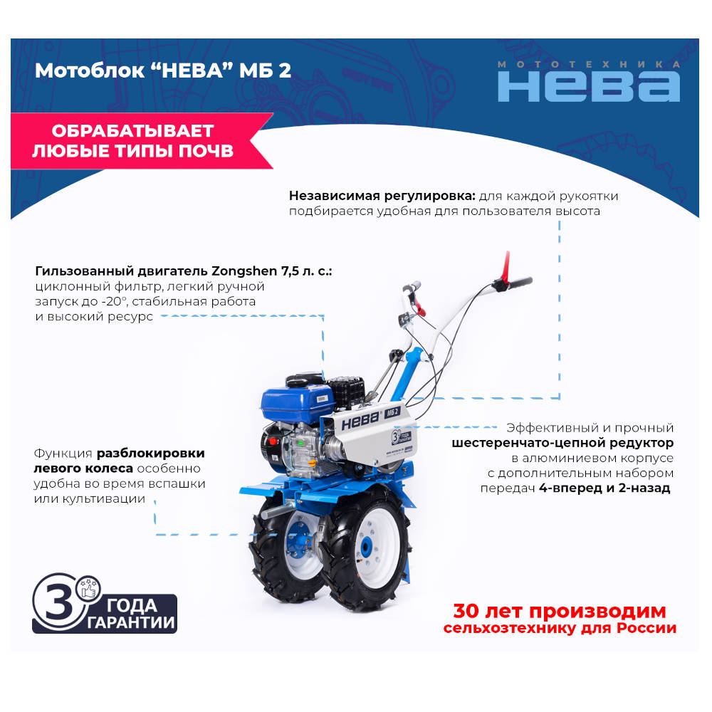 Мотоблок Нева МБ2 (GB225) производит вспашку, культивацию, нарезку борозд, окучивание, прополку междурядий, посадку картофеля, выкапывание картофеля, уборку снега и мусора, кошение травы, перевозку грузов, колку дров. Бензиновый двигатель GB225 является одноцилиндровым, четырехтактным, имеет воздушное охлаждение и конструкцию верхнего клапана (OHV). 4 фрезы изготовлены из закаленной стали. Особый угол заточки позволяет их использовать для обработки всех типов почв.