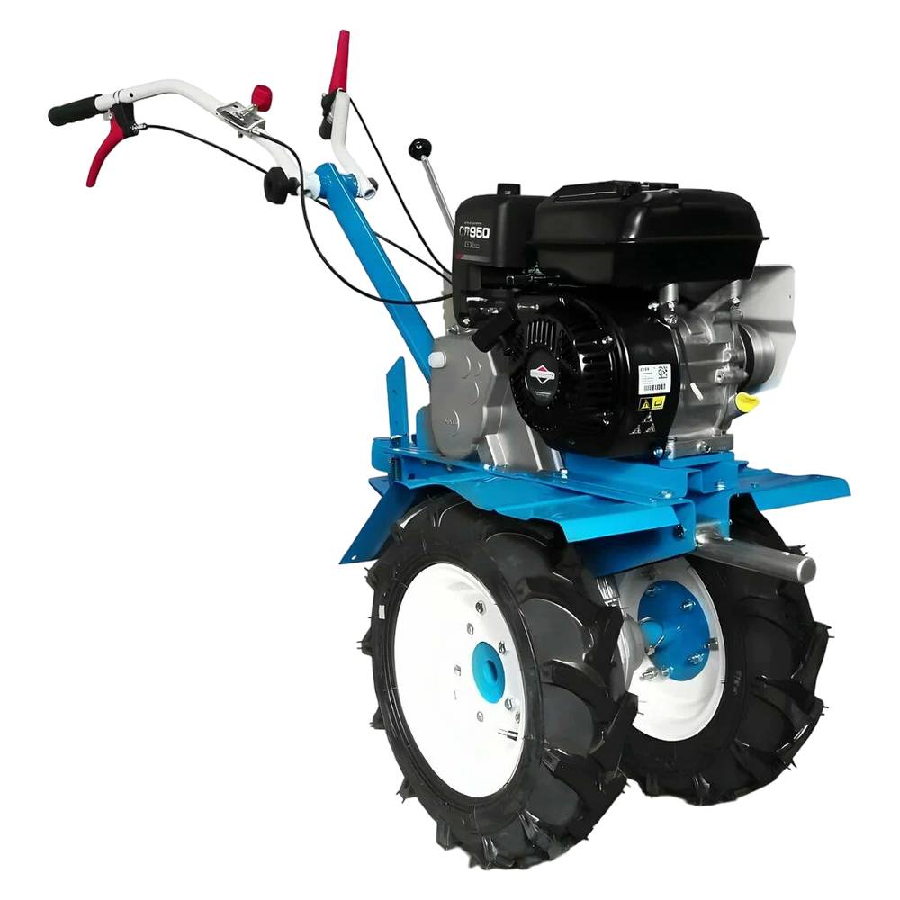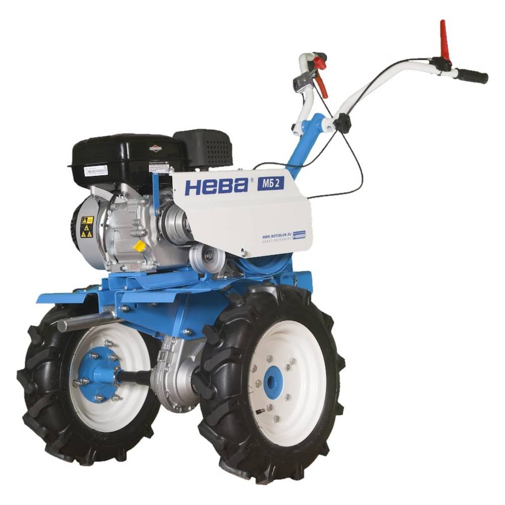 Мотоблок Нева МБ2 МультиАГРО (CR950) – функциональный многоскоростной агрегат, с четырёхтактным двигателем CR950 мощностью 6,5 л.с., или 4,8 кВт. Редуктор шестерёнчато-цепной, сцепление ременное. Объём двигателя 208 кубических сантиметров. Ёмкость топливного бака 3,1 литра. Широкий диапазон скоростей 6 передних и 2 задних позволяет подобрать наиболее оптимальную скорость для работы на выбранных участках территории. В холодное время года мотоблок можно использовать для уборки снега. Также оборудование применяется для транспортировки грузов. Глубина вспашки 200 мм, ширина 1260 мм. Максимальный диаметр фрезы 360 мм. Вес агрегата 91 кг.
