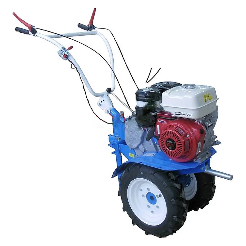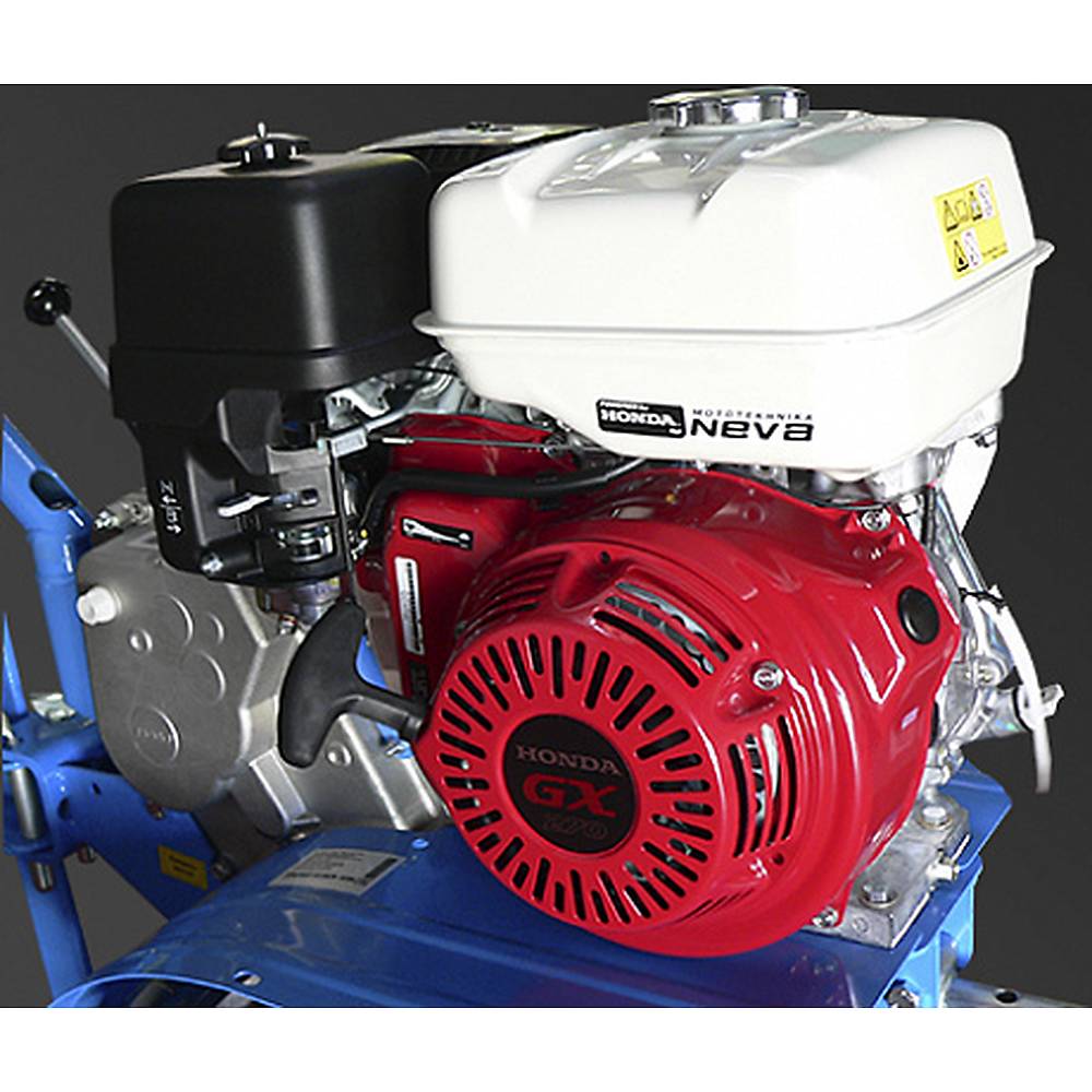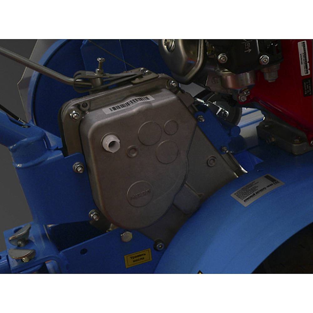 Мотоблок оснащен двигателем GX270 мощностью 9 л.с. Объем топливного бака 5,9 л позволяет работать долгое время без дозаправки. Шестеренчато-цепной редуктор обеспечивает движение техники на 4 скоростях вперед и 2 назад.