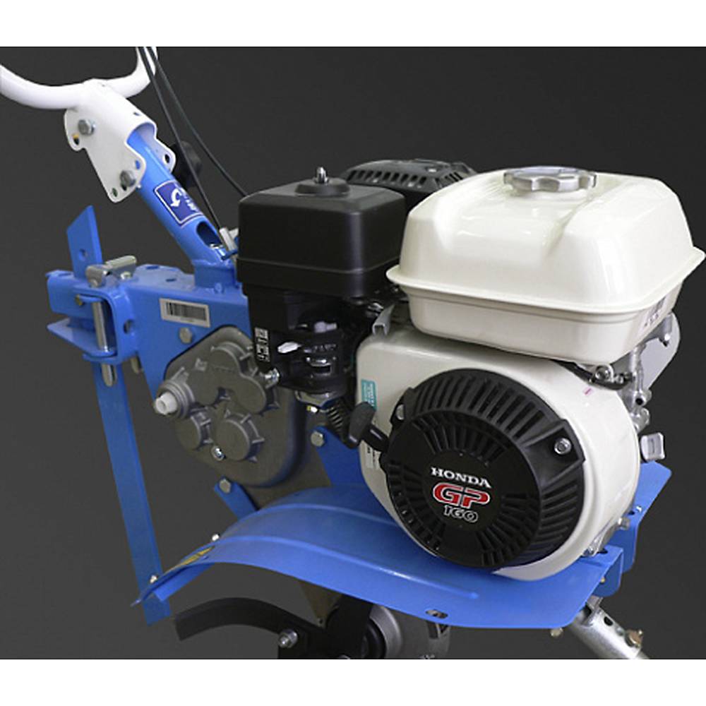 Мотокультиватор оснащен бензиновым двигателем мощностью 4,9 л.с. Объем топливного бака 3,1 л позволяет обрабатывать участки небольшой площади, не прерываясь на дозаправку. Шестеренчато-цепной редуктор обеспечивает движение культиватора на 2 скоростях вперед и 1 назад. Скорость вращения фрез 90-130 об/мин позволяет за 1 проход подготовить землю к посадке.