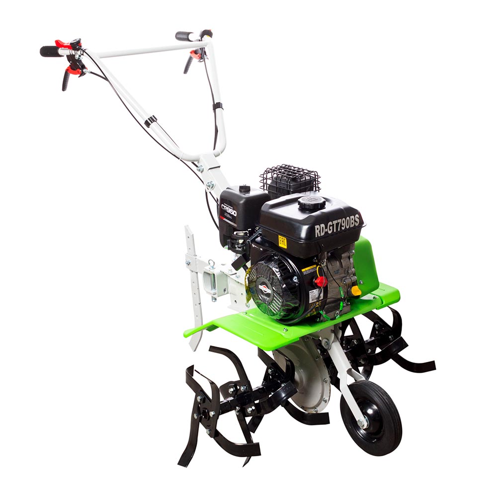 Мотокультиватор REDVERG RD-GT790BS надёжный и производительный агрегат с четырёхтактным двигателем Briggs&Stratton RS 950, мощность которого составляет 6,5 л.с. или 4850 Вт. Объём двигателя 208 кубических сантиметров. Сцепление ременное. Ёмкость масляного бака 0,6 литра. Ёмкость топливного бака 3,1 литра, что позволяет поддерживать продолжительный рабочий цикл. Фрезы кованные разборные. Диаметр фрезы 300 мм. Ширина культивации 790 мм. Глубина вспашки 330 мм. Большие колёса, передняя и задняя скорости обеспечивают манёвренность инструмента в процессе эксплуатации и транспортировки. Вес товара насчитывает 52 кг.